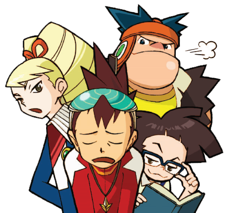 1girl 3boys black_hair blonde_hair book bow brown_hair bud_bison_(mega_man) closed_eyes eyewear_on_head geo_stelar_(mega_man) glasses hair_bow holding holding_book jewelry long_hair lowres luna_platz_(mega_man) mega_man_(series) mega_man_star_force_(series) multiple_boys necklace official_art third-party_source zack_temple_(mega_man)