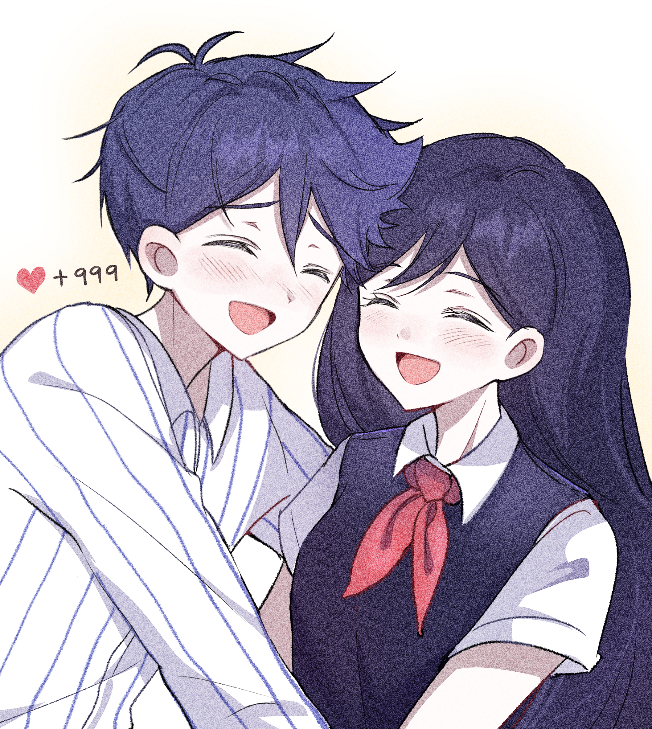 1boy 1girl alternate_color antenna_hair black_sweater_vest blush breasts closed_eyes collared_shirt colored_skin double-parted_bangs film_grain hair_behind_ear hair_between_eyes heart hero_(headspace)_(omori) hero_(omori) highres long_hair long_sleeves mari_(headspace)_(omori) mari_(omori) neckerchief omori open_mouth pajamas purple_hair red_neckerchief shirt short_hair short_sleeves simple_background small_breasts smile striped_clothes striped_pajamas sweater_vest vertical-striped_clothes vertical-striped_pajamas white_background white_shirt white_skin wktdms1