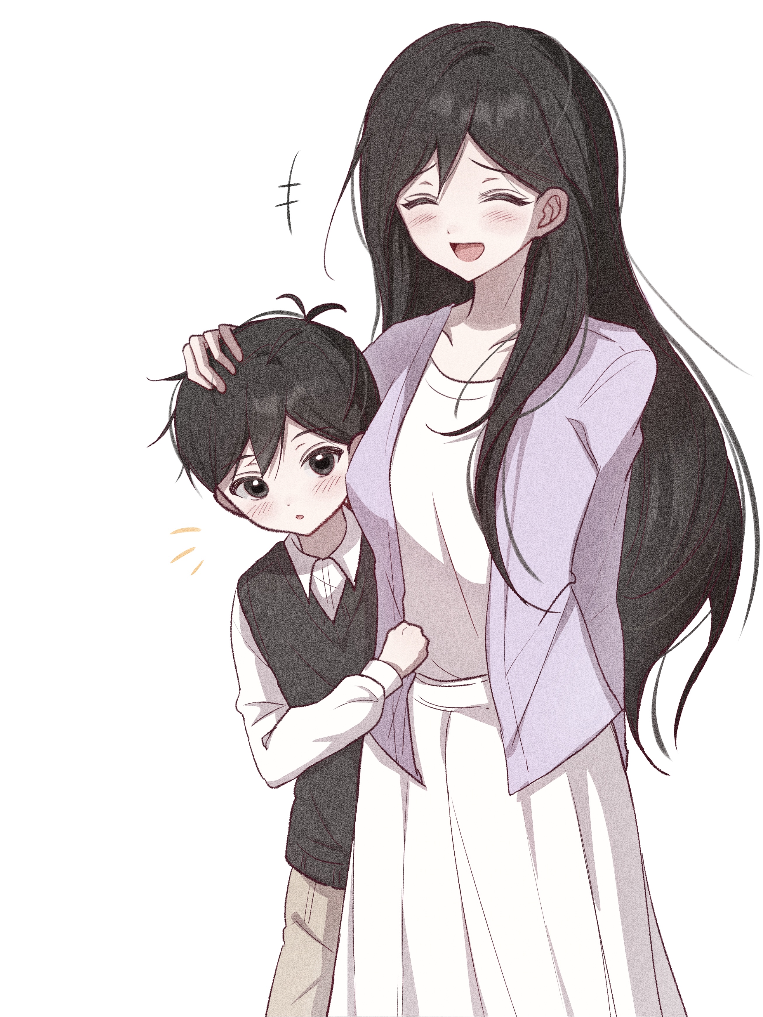 +++ 1boy 1girl :d :o ^_^ absurdres alternate_sleeve_length antenna_hair black_eyes black_hair black_sweater_vest blush breasts brown_pants chest_height closed_eyes collared_shirt cowboy_shot double-parted_bangs dress film_grain hair_behind_ear hair_between_eyes hair_over_shoulder hand_on_another's_head height_difference highres jacket long_hair long_sleeves looking_at_viewer mari_(faraway)_(omori) mari_(omori) medium_breasts notice_lines omori open_clothes open_jacket open_mouth pants pleated_dress puffy_long_sleeves puffy_sleeves purple_jacket raised_inner_eyebrows shirt short_hair smile standing sunny_(omori) sweater_vest tongue very_long_hair very_short_hair white_dress white_shirt wktdms1