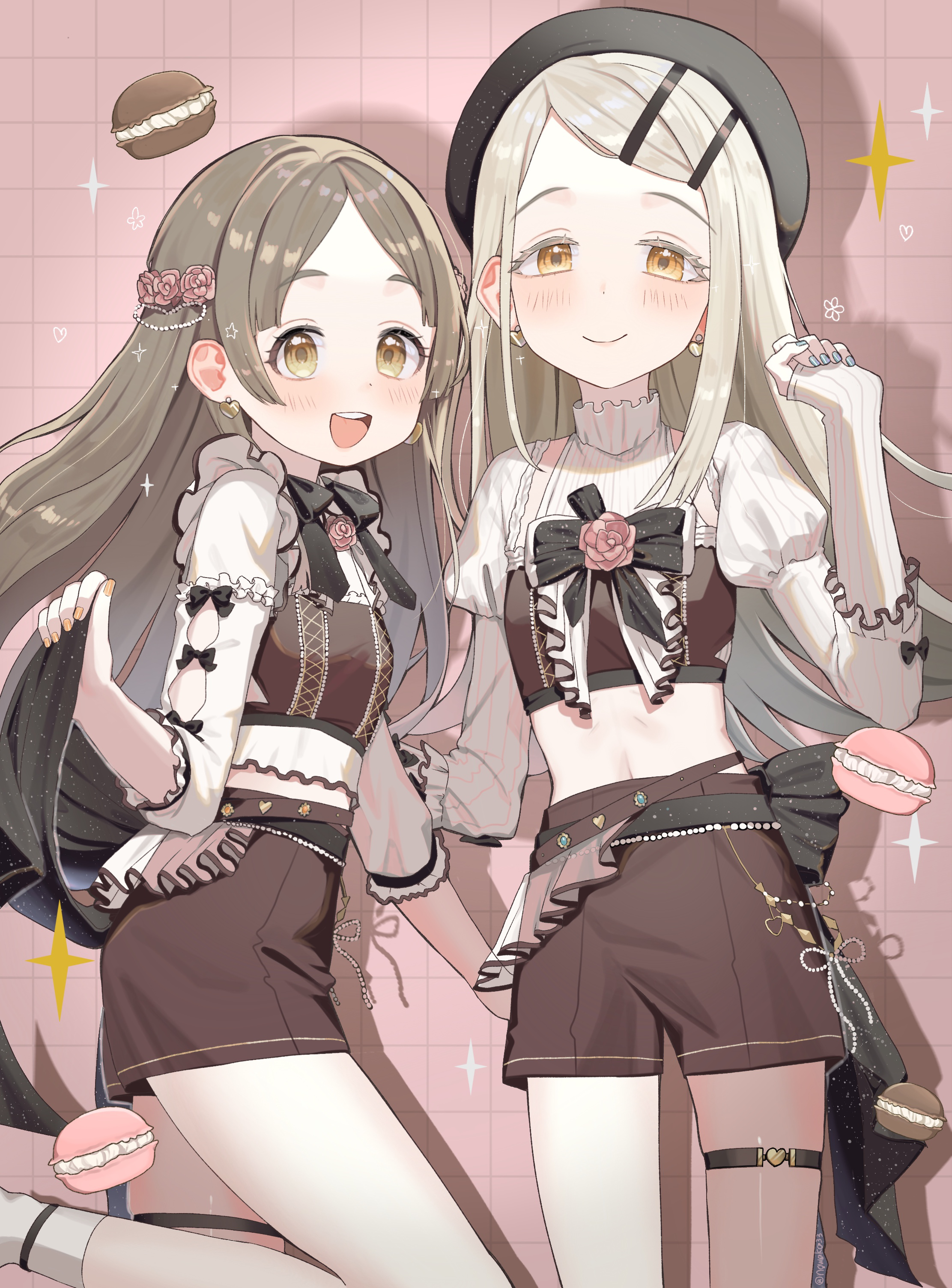 2girls :d absurdres belt beret black_bow black_bowtie black_hat blonde_hair blue_nails blush bow bowtie breasts brooch brown_eyes brown_hair brown_shirt brown_shorts checkered_background closed_mouth colored_eyelashes commentary_request cowboy_shot cropped_shirt earrings fingernails flipped_hair flower flower_brooch food frilled_sleeves frills gakuen_idolmaster hair_flower hair_ornament hairclip hand_up hat heart heart_earrings highres idolmaster jewelry juliet_sleeves kuramoto_china long_hair long_sleeves looking_at_viewer macaron midriff multiple_girls nail_polish noko_(nowako33) open_mouth orange_eyes parallel_hairclips parted_bangs pink_background pink_flower pink_rose puffy_sleeves rose shinosawa_hiro shirt shorts showgirl_skirt skirt_hold small_breasts smile standing stud_earrings thigh_belt thigh_strap