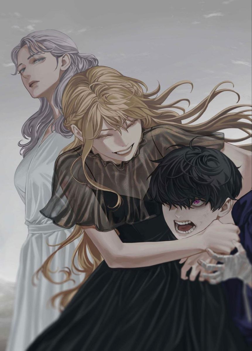 1boy 2girls abyssal_black_flame_dragon_(omniscient_reader's_viewpoint) bags_under_eyes black_dress black_hair blackbox_(blackbox9158) blonde_hair capelet character_request check_character claw_pose closed_eyes dress gabriel_(omniscient_reader's_viewpoint) grin hair_over_one_eye hand_on_another's_face hand_up highres looking_at_viewer multiple_girls official_art omniscient_reader's_viewpoint open_mouth pink_hair red_eyes screaming short_hair smile third-party_source uriel_(omniscient_reader's_viewpoint) white_dress white_eyes
