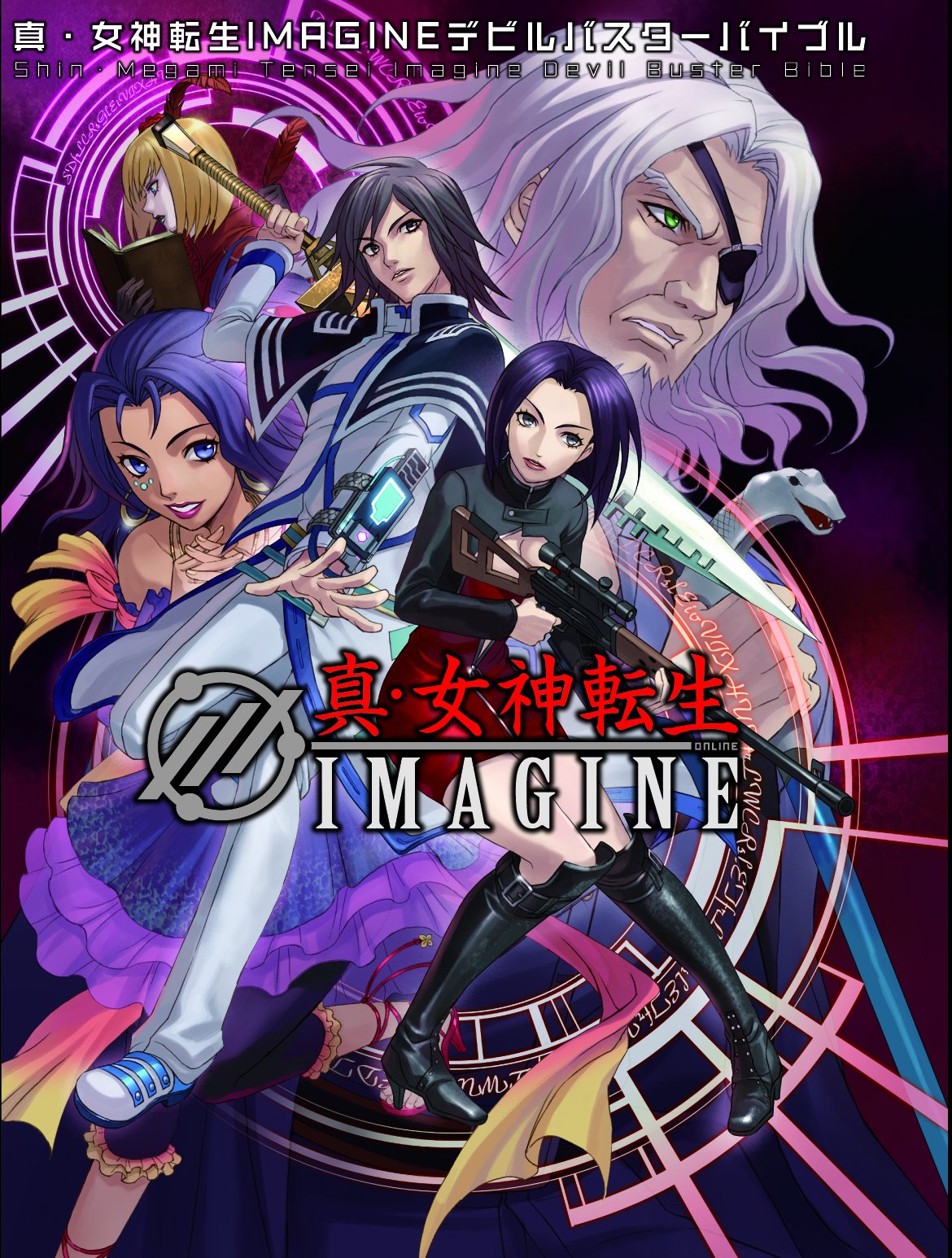 2boys 3girls artist_request beard black_hair blonde_hair blue_eyes blue_hair book boots breasts chizuru_(megami_tensei) cleavage comp_(megami_tensei) copyright_name dress earrings eyepatch facial_hair fangs feathers fei_(megami_tensei) female_protagonist_(shin_megami_tensei_imagine) frown green_eyes gun high_heel_boots high_heels highres holding holding_book holding_gun holding_sword holding_weapon jewelry knee_boots male_protagonist_(shin_megami_tensei_imagine) multiple_boys multiple_girls necklace official_art purple_hair quill red_feathers rifle shin_megami_tensei shin_megami_tensei_imagine smile snake snakeman_(megami_tensei) sniper_rifle sword third-party_source weapon white_hair