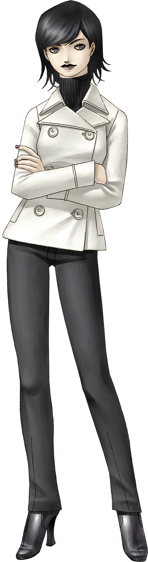 1girl black_hair black_pants black_sweater buttons coat crossed_arms double-breasted grey_eyes grey_lips grey_nails high_heels highres kazuma_kaneko official_art pants peacoat shin_megami_tensei shin_megami_tensei_iii:_nocturne solo standing sweater takao_yuko third-party_source transparent_background turtleneck turtleneck_sweater white_coat