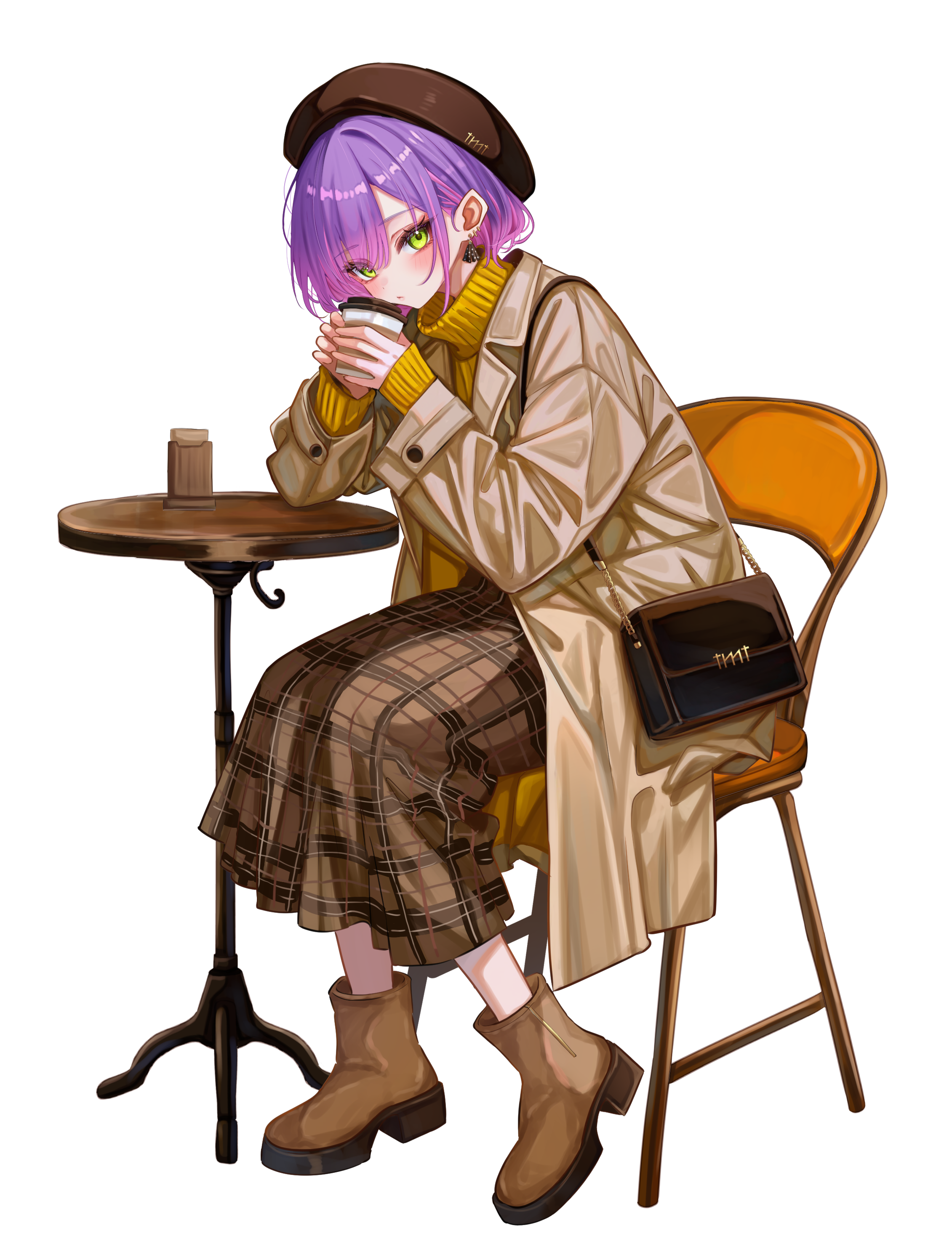1girl absurdres bag beret bob_cut boots border brown_boots brown_coat brown_hat chair coat comiket_107 commentary_request cup disposable_cup earrings full_body gradient_hair green_eyes hat highres holding holding_cup hololive jewelry long_skirt looking_at_viewer multicolored_hair on_chair outdoors outside_border pink_hair plaid_clothes plaid_skirt pointy_ears purple_hair revision ribbed_sweater sa-ya2 short_hair shoulder_bag simple_background sitting skirt solo sweater tokoyami_towa transparent_background turtleneck turtleneck_sweater virtual_youtuber white_border yellow_sweater