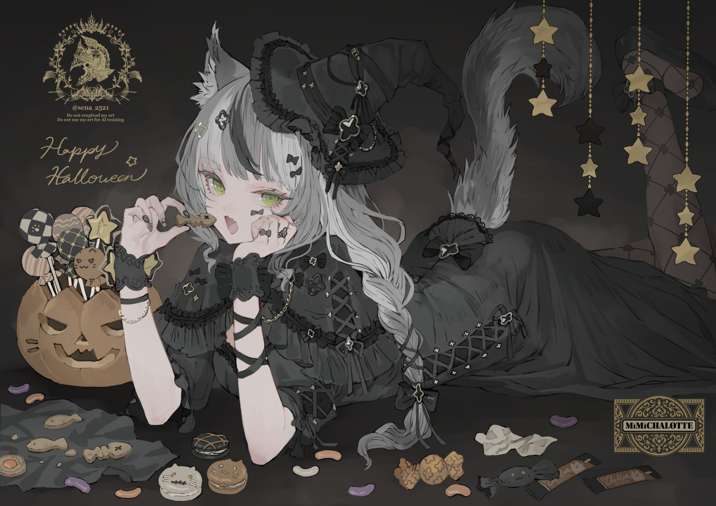 1girl animal_ear_fluff animal_ears black_background black_dress black_hat black_pantyhose black_shoes black_wrist_cuffs braid candy chocolate chocolate_bar commentary_request dress food full_body green_eyes grey_hair halloween happy_halloween hat hat_over_one_ear holding holding_food jack-o'-lantern lollipop long_hair lying macaron multicolored_hair on_stomach open_mouth original pantyhose revision senano-yu shoes simple_background solo streaked_hair tail the_pose watermark witch_hat wrist_cuffs