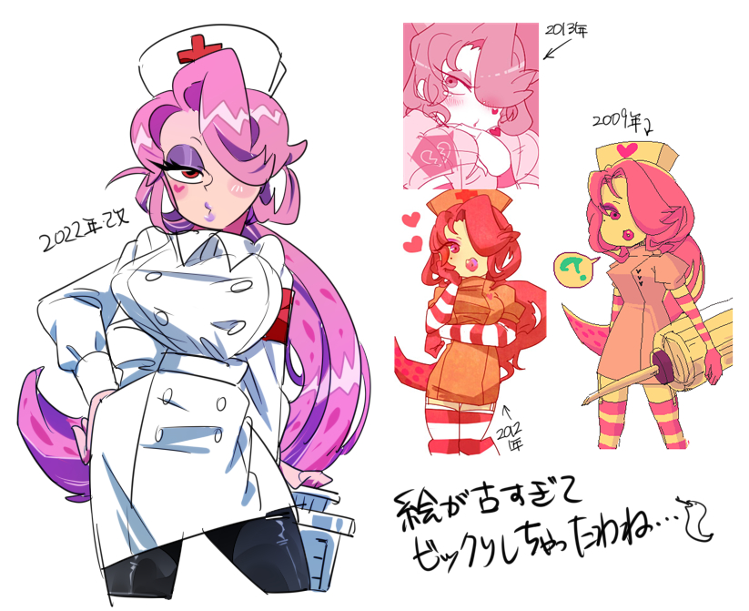 1girl armband black_pantyhose breasts button_dress catherine_(gregory_horror_show) collared_dress commentary_request cross curtained_hair dated dress eyeshadow facial_mark flipped_bangs gloves gregory_horror_show hair_over_one_eye half-closed_eyes hand_on_own_hip hat heart heart_facial_mark heart_on_cheek holding holding_syringe humanization large_breasts large_syringe long_hair long_sleeves looking_at_viewer low_ponytail makeup marking_on_cheek needle nurse nurse_cap nurse_dress o3o one_eye_covered oversized_object pantyhose parted_bangs pink_hair ponytail puckered_lips purple_eyeshadow red_armband red_cross red_eyes simple_background solo striped_clothes striped_gloves striped_thighhighs syringe thighhighs translation_request uno_uno white_hat wide_hips