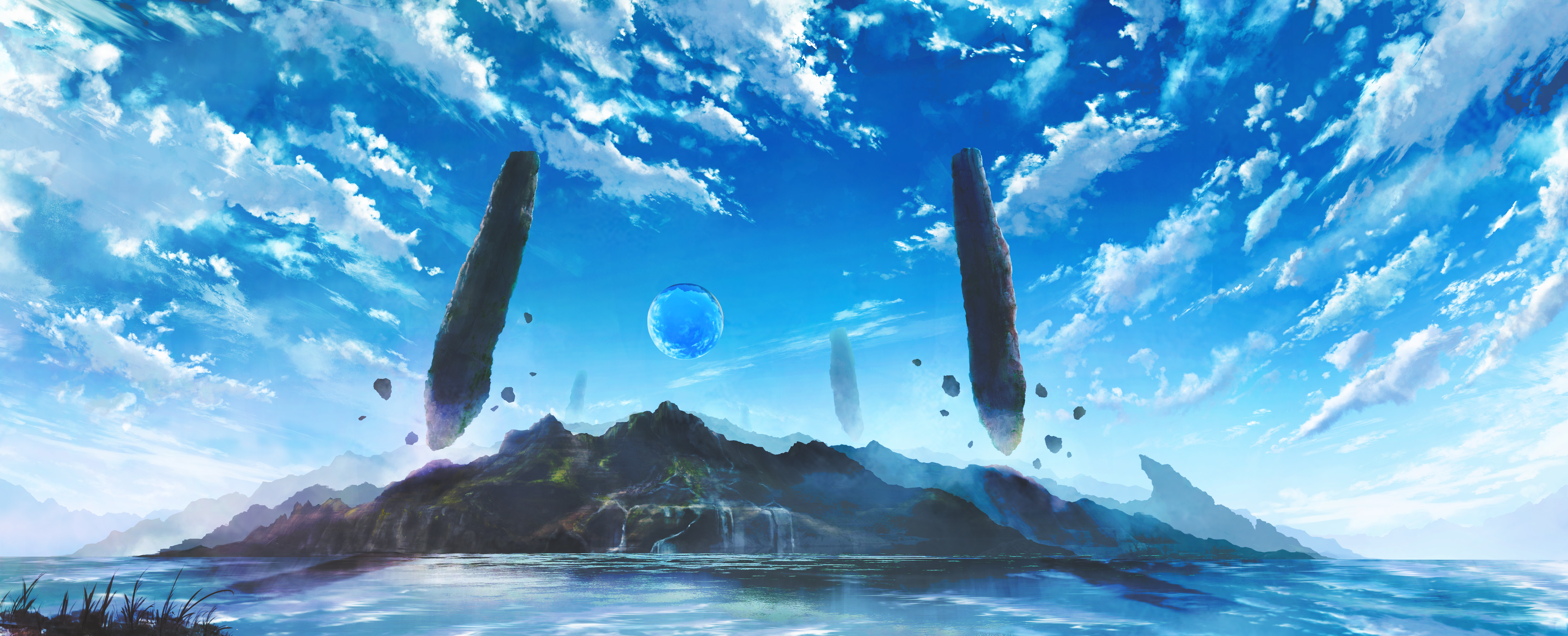 absurdres an_yomogi blue_sky chinese_commentary cloud commentary_request concept_art day fantasy floating floating_object highres huge_filesize landscape no_humans ocean orb original outdoors scenery shore sky water waterfall