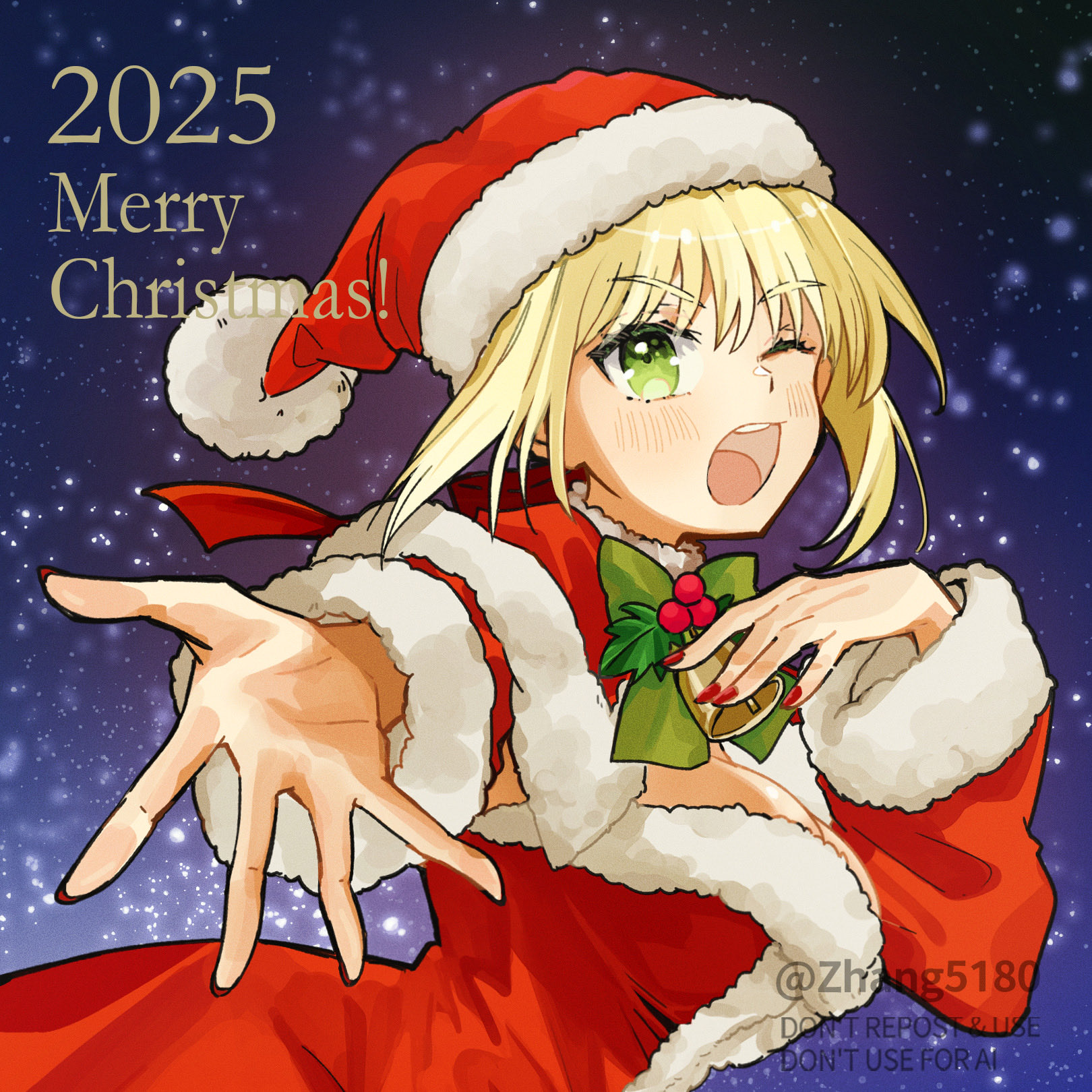 1girl bell blonde_hair bow breasts christmas cleavage commentary dress english_commentary fate/extra fate_(series) green_bow green_eyes hat highres holly large_breasts looking_at_viewer nero_claudius_(fate) nero_claudius_(fate/extra) one_eye_closed open_mouth reaching reaching_towards_viewer red_nails santa_costume santa_dress santa_hat solo star_(sky) starry_sky_background zhang5180