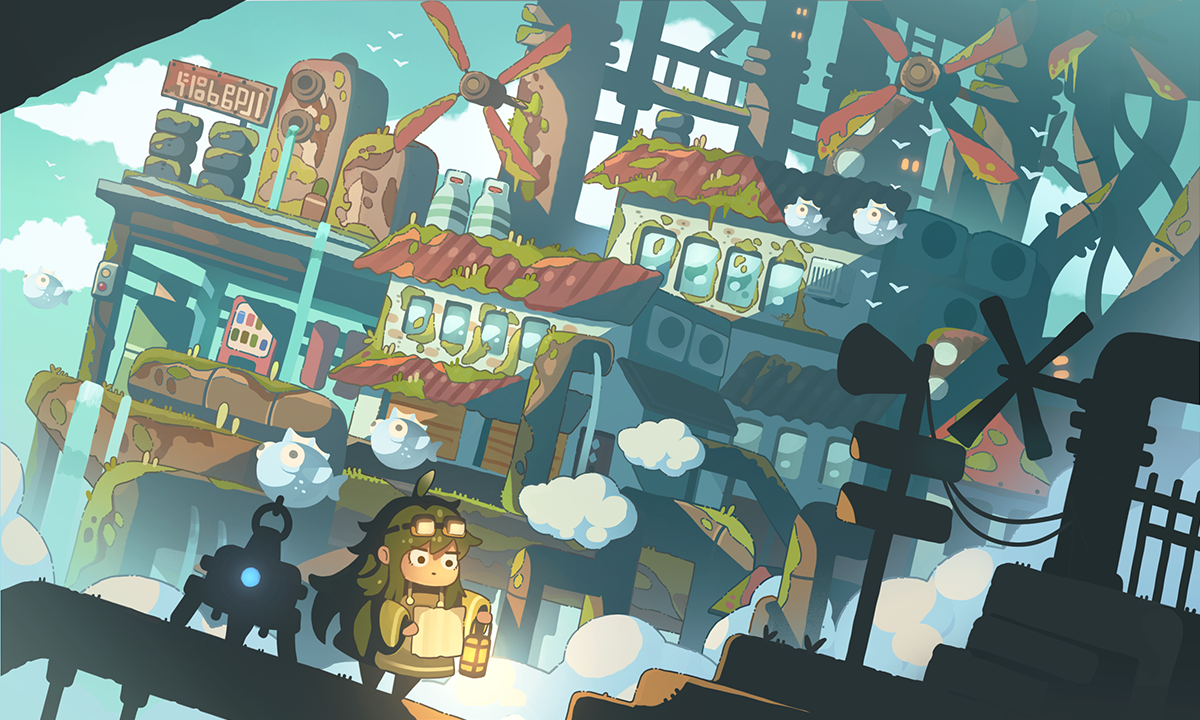 1girl ahoge apokarihardcore bird black_eyes blue_sky closed_mouth cloud commentary_request day fantasy fish goggles goggles_on_head green_hair holding holding_lantern lantern long_hair original outdoors scenery sky solo stairs windmill