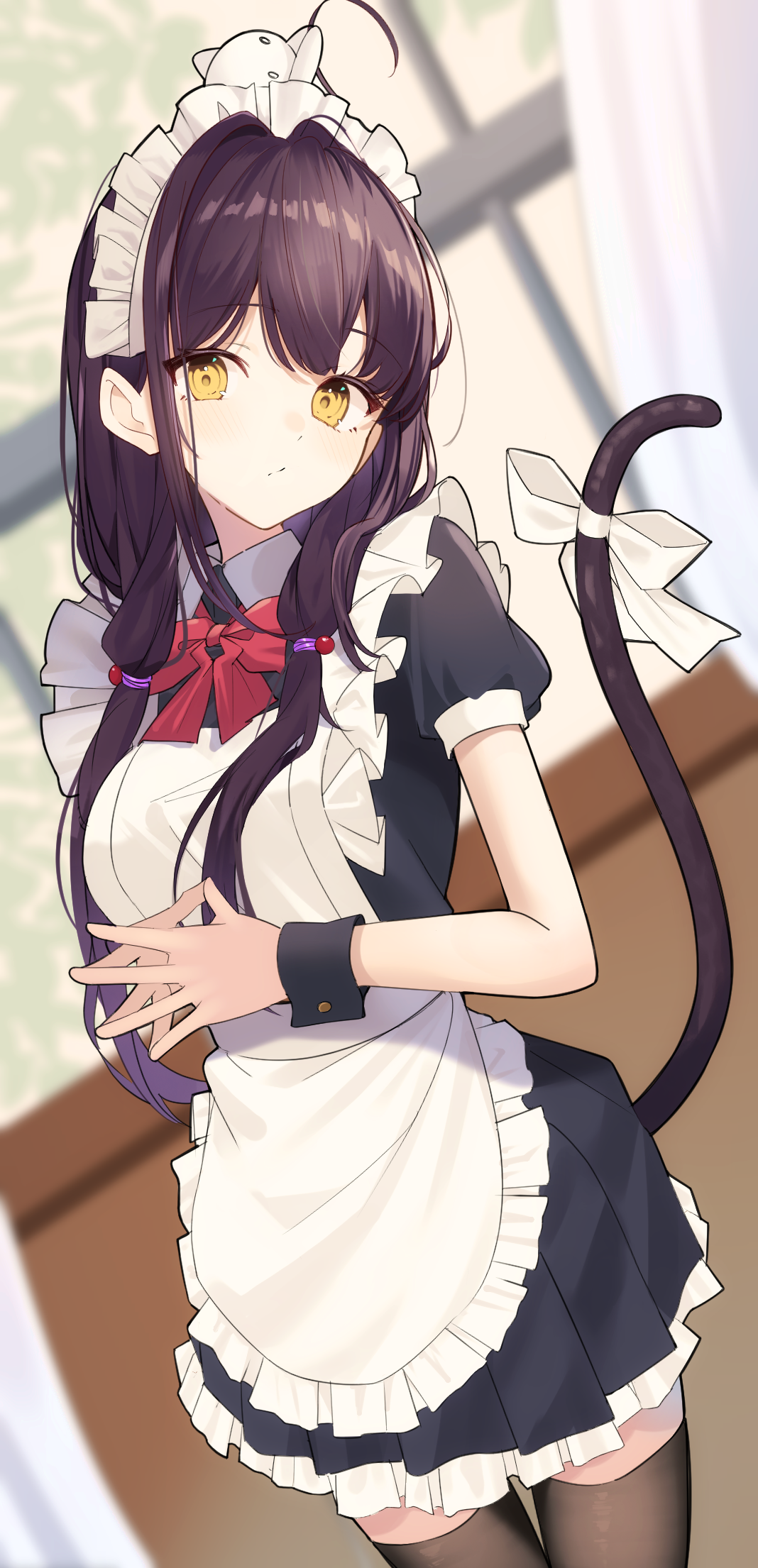 1girl :/ alternate_costume apron asakura_karen_(heaven_burns_red) black_dress blurry blurry_background bow bowtie brown_hair brown_thighhighs cat_tail chroemaguro commentary_request dress dutch_angle enmaided frilled_apron frills heaven_burns_red highres indoors long_hair looking_at_viewer maid maid_apron own_hands_together paid_reward_available petticoat puffy_short_sleeves puffy_sleeves red_bow red_bowtie short_sleeves solo steepled_fingers tail tail_bow tail_ornament thighhighs twintails very_long_hair white_apron wrist_cuffs yellow_eyes zettai_ryouiki