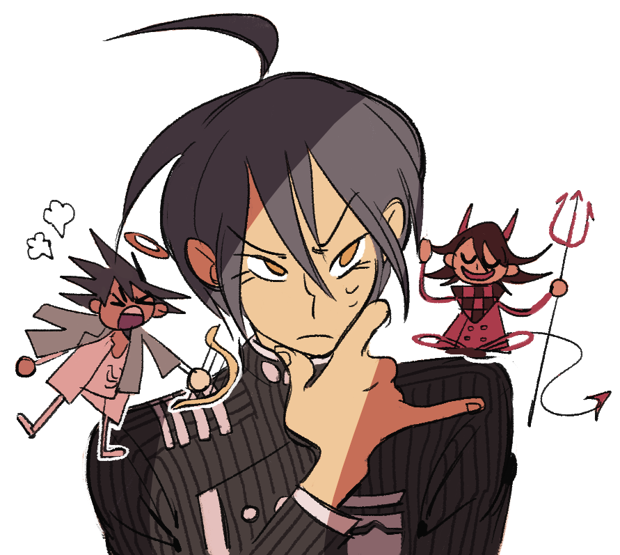 3boys angel angel_and_devil angry blue_hair danganronpa_(series) danganronpa_v3:_killing_harmony demon demon_tail halo head_steam holding holding_instrument holding_lyre holding_pitchfork instrument lyre momota_kaito multiple_boys mutie_(timestables) oma_kokichi pitchfork saihara_shuichi shoulder_angel shoulder_devil shouting smile tail thinking yellow_eyes
