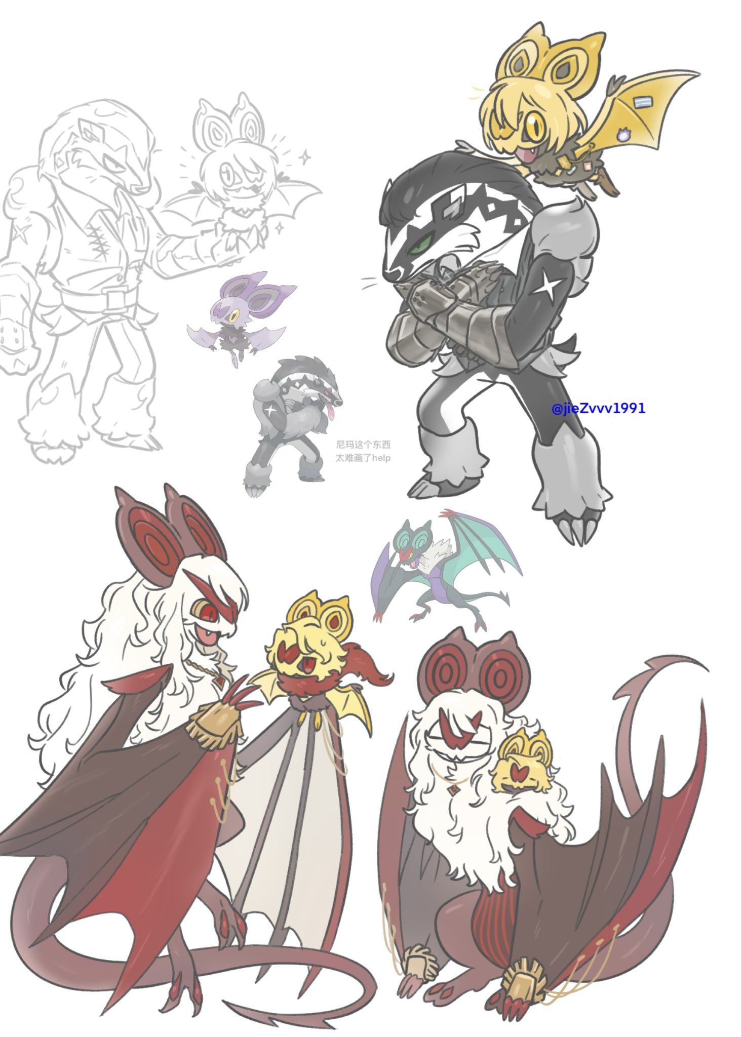 black_gloves blonde_hair commentary_request crossed_arms don_quixote_(project_moon) gen_6_pokemon gen_8_pokemon gloves green_eyes highres la_manchaland's_don_quixote_(project_moon) limbus_company long_hair meursault_(project_moon) nintendo noibat noivern obstagoon ohzv pokemon pokemon_(creature) project_moon sancho_(project_moon) short_hair simple_background wavy_hair white_background white_hair yellow_eyes