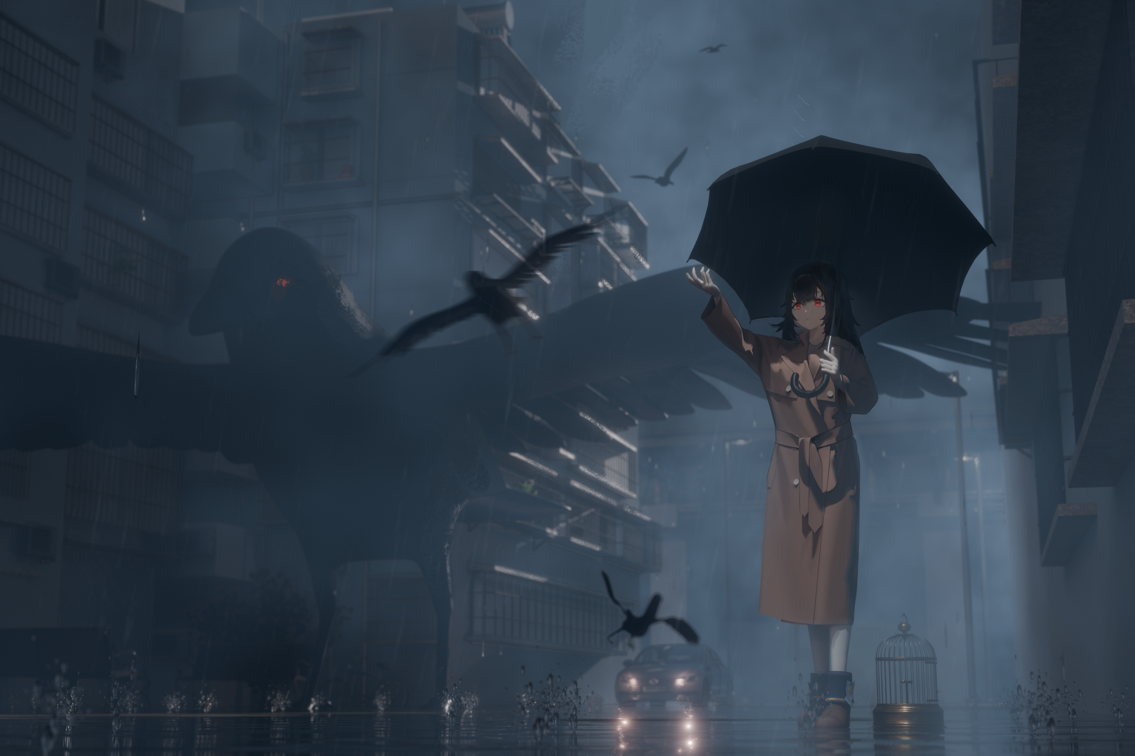1girl 3d absurdres animal bird birdcage black_hair black_umbrella brown_coat building cage car chinese_commentary closed_mouth coat commentary_request crow expressionless hands_up highres holding holding_umbrella long_hair motion_blur motor_vehicle night original outdoors overcast oversized_animal rain red_eyes scenery shoes simple_bird sky solo splashing trench_coat umbrella urban walking water water_drop xiaojian_(dgha2728)