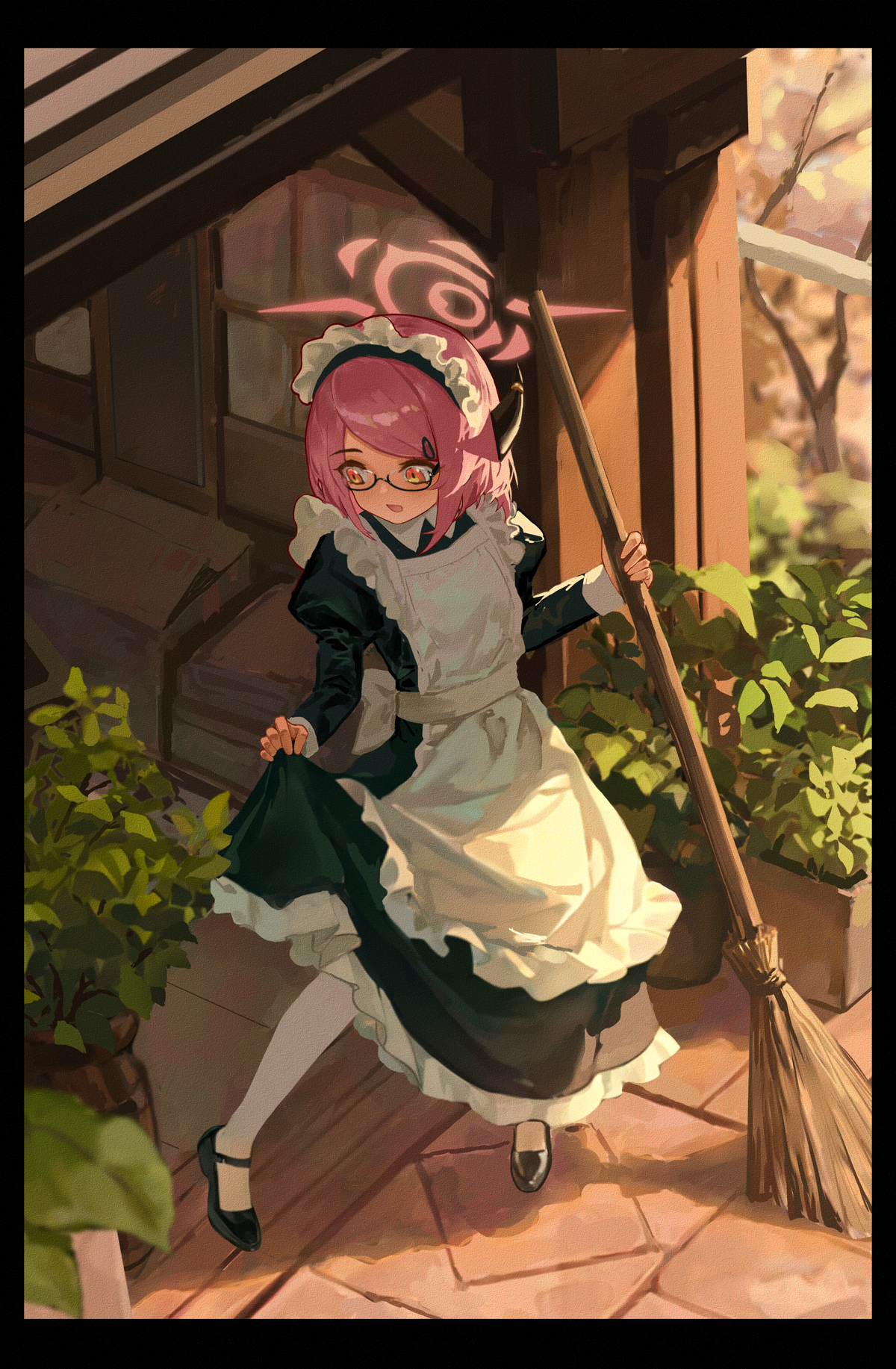 1girl aged_down aircctzillie alternate_costume apron aru_(blue_archive) aru_(young)_(blue_archive) black_dress black_shoes blue_archive broom brown_horns chinese_commentary clothes_lift commentary commentary_request demon_horns dress english_commentary enmaided frilled_apron frills from_above full_body glasses hair_ornament hairclip halo highres holding holding_broom horns juliet_sleeves long_sleeves maid maid_apron maid_headdress mary_janes mixed-language_commentary open_mouth orange_eyes pantyhose pink_hair pink_halo plant potted_plant puffy_sleeves shoes short_hair skirt skirt_lift solo white_apron white_pantyhose