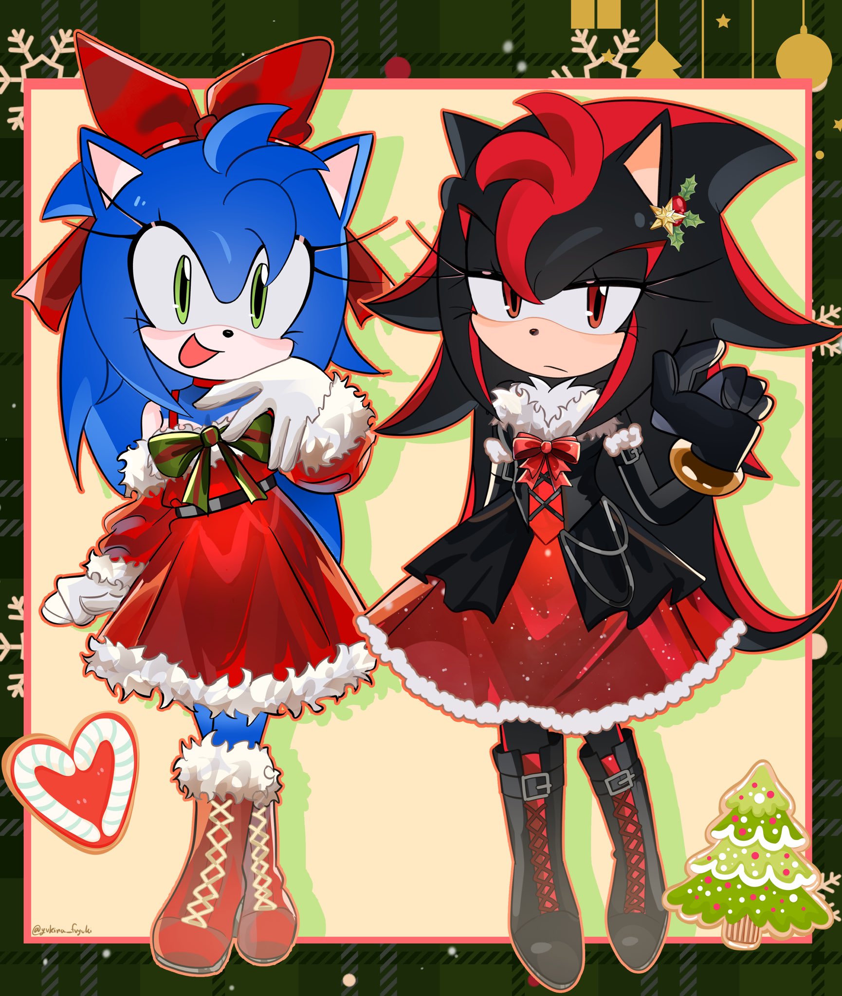 2girls :/ :d belt black_belt black_bodice black_boots black_corset black_fur black_gloves blue_fur boots bow bowtie bubble_skirt choker christmas christmas_hair_ornament christmas_ornaments christmas_tree closed_mouth corset crossed_legs dress drop_shadow full_body furry genderswap genderswap_(mtf) gloves green_bow green_bowtie green_eyes hairband heart hedgehog_girl highres long_eyelashes long_hair looking_at_viewer multicolored_hair multiple_girls open_mouth puffy_dress puffy_sleeves red_boots red_bow red_bowtie red_choker red_dress red_eyes red_fur red_hairband red_skirt shadow_the_hedgehog skirt sleeve_belt smile snow snowflake_print sonic_(series) sonic_the_hedgehog standing twitter_username watson_cross white_gloves yukina_fuyuki
