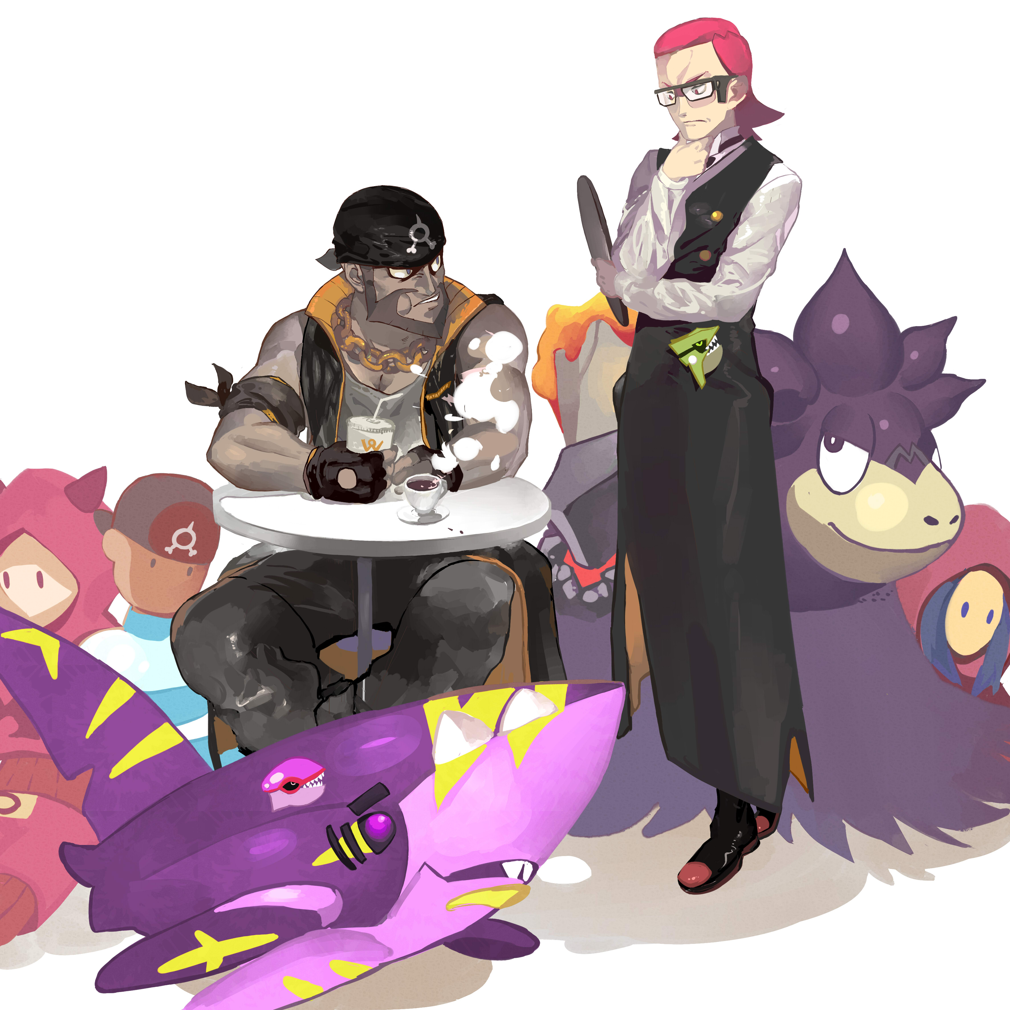 2boys absurdres alternate_color alternate_universe archie_(pokemon) beard black_gloves black_pants camerupt chewing commentary cup dark-skinned_male dark_skin disposable_cup english_commentary facial_hair fingerless_gloves gen_3_pokemon glasses gloves groudon highres hiro_(user_negm3832) jacket kyogre leather leather_jacket legendary_pokemon male_focus maxie_(pokemon) mega_camerupt mega_pokemon mega_sharpedo multiple_boys nintendo pants pokemon pokemon_(creature) pokemon_oras red_hair sharpedo shiny_pokemon shirt short_hair sitting table teacup team_aqua_grunt team_magma_grunt thinking waiter white_shirt