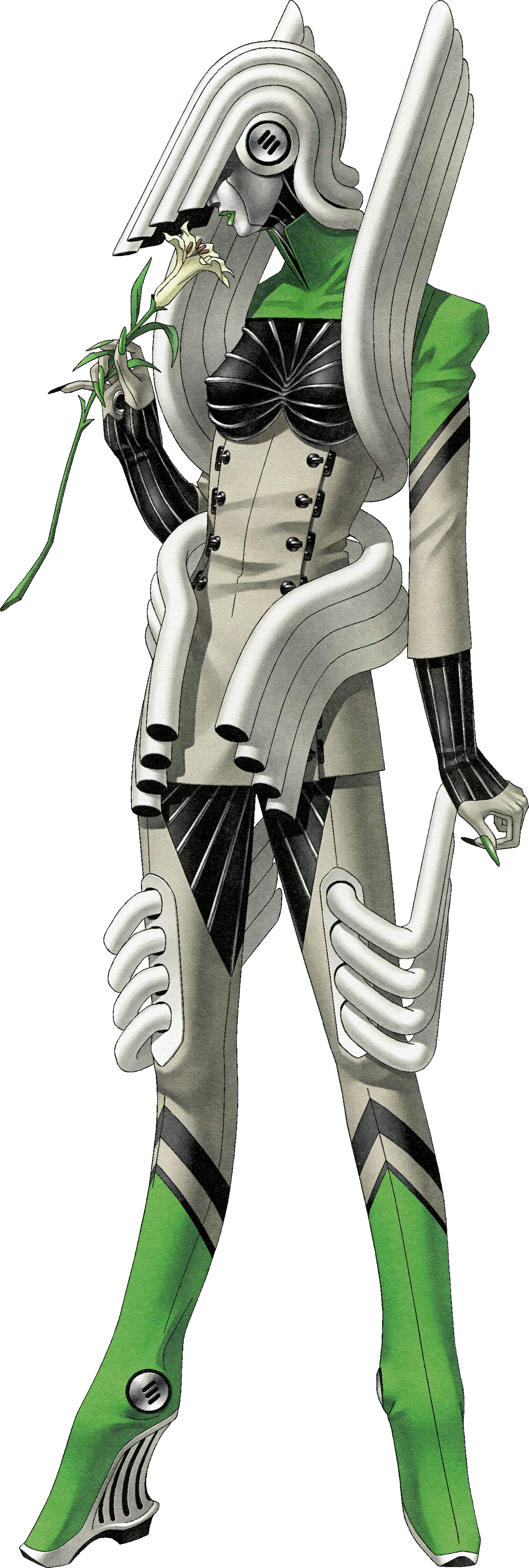 1girl absurdres breasts colored_skin flower gabriel_(persona_2) green_lips green_nails grey_skin highres holding holding_flower kazuma_kaneko lily_(flower) official_art open_mouth persona persona_(summon) persona_2 persona_2_batsu solo standing third-party_source transparent_background