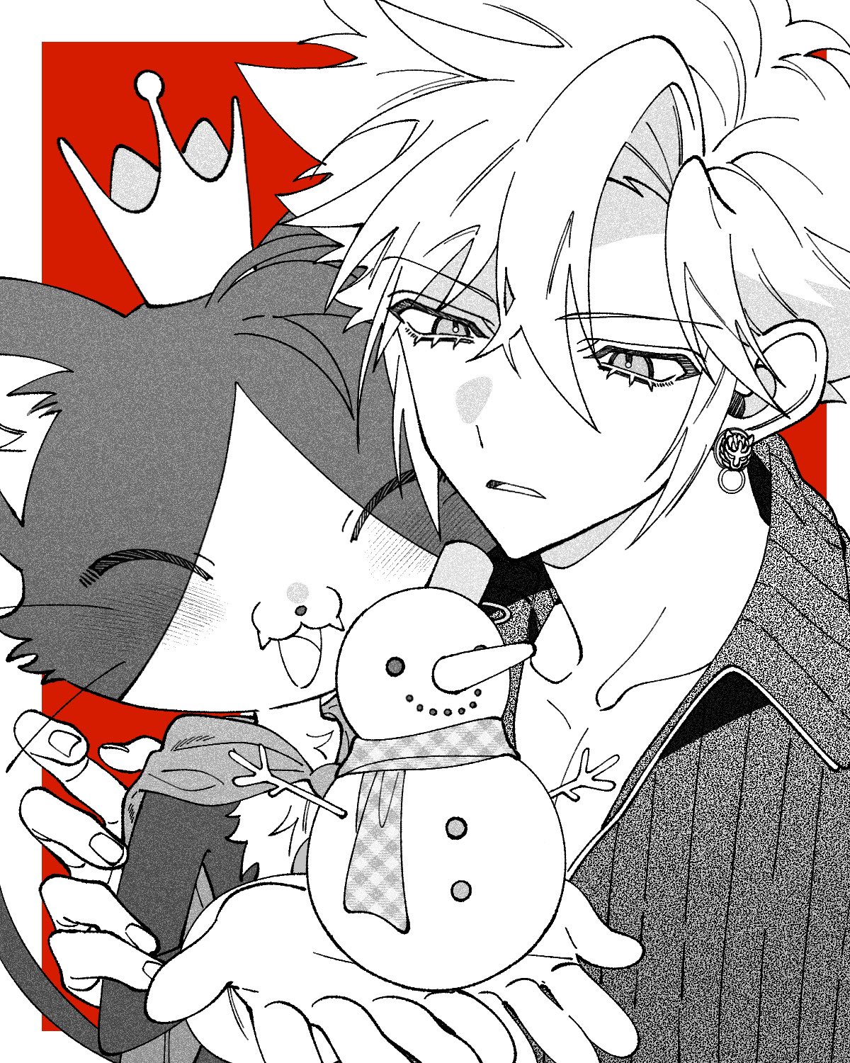 1boy animal black_vest blush border cait_sith_(final_fantasy) cape cat closed_eyes cloud_strife crown fenrir_(final_fantasy) final_fantasy final_fantasy_vii final_fantasy_vii:_advent_children gloves hair_between_eyes highres holding holding_animal holding_cat male_focus mini_crown mob_bouto_1 open_mouth parted_lips red_background short_hair smile snowman spiked_hair tuxedo_cat upper_body vest white_border white_gloves