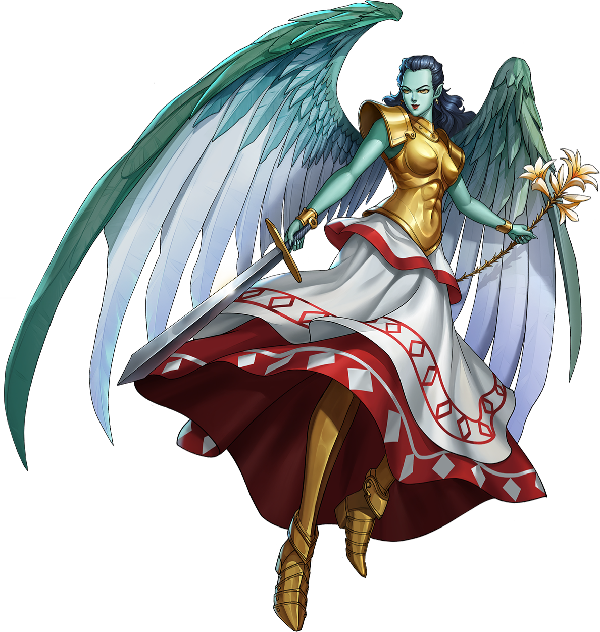 1girl angel angel_wings armor artist_request black_hair boobplate breastplate breasts colored_skin cross cross_earrings demon_(megami_tensei) earrings feathered_wings flower gabriel_(megami_tensei) gold_armor green_skin highres holding holding_flower holding_sword holding_weapon jewelry official_art persona persona_5 persona_5:_the_phantom_x shin_megami_tensei solo sword third-party_source transparent_background weapon wings