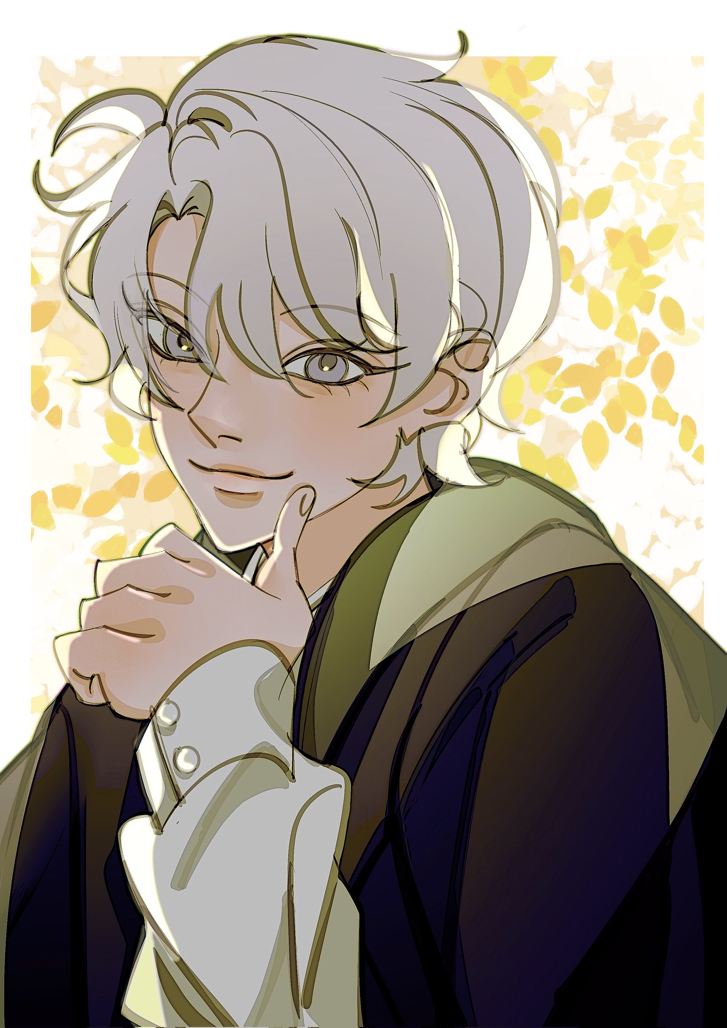 1boy black_robe draco_malfoy ellie grey_eyes harry_potter_(series) highres hogwarts_school_uniform hooded_robe male_focus robe school_uniform short_hair slytherin smile solo wizarding_world