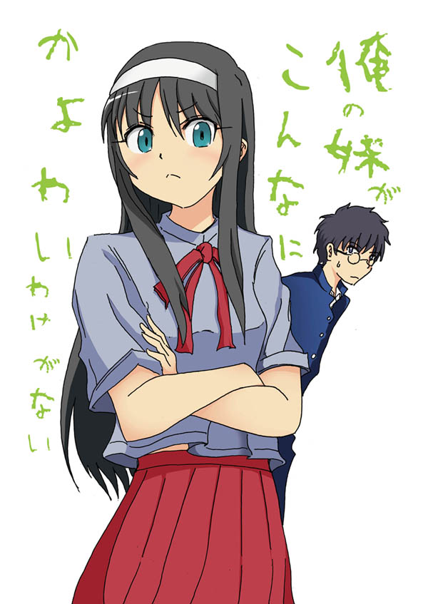 1boy 1girl annoyed black_hair blue_eyes blush bow brother_and_sister can't_be_this_cute embarrassed glasses hairband japanese_text long_hair looking_at_viewer ore_no_imouto_ga_konna_ni_kawaii_wake_ga_nai parody ribbon school_uniform short_hair siblings skirt spiked_hair sweat sweatdrop tohno_akiha tohno_shiki tsukihime white_background white_hairband
