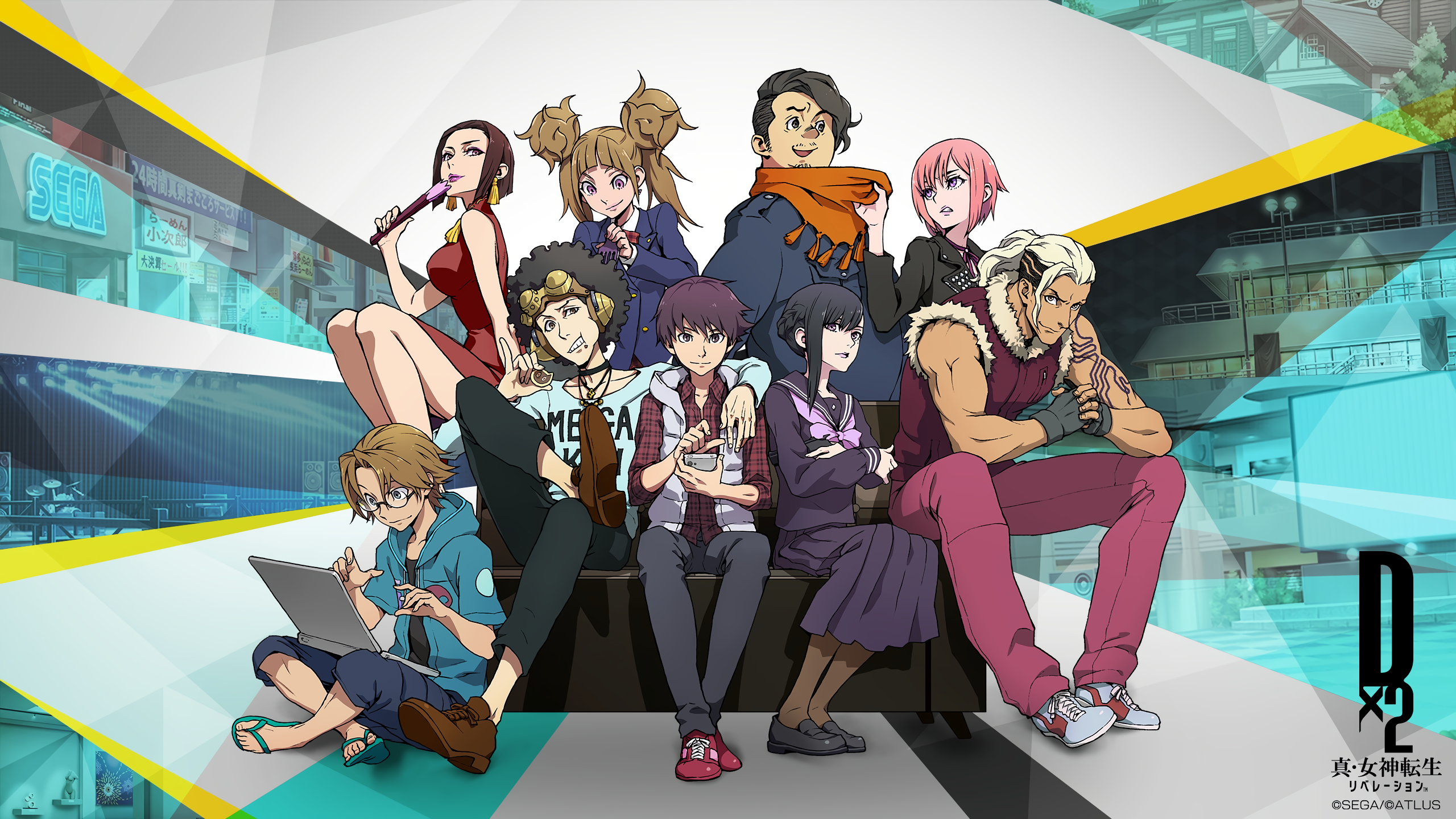 4girls 5boys afro arm_around_shoulder arm_tattoo artist_request black_hair black_shoes brown_hair brown_shoes cellphone comb computer copyright_name couch dress earrings facial_hair fingerless_gloves flip-flops fur-trimmed_vest fur_trim fuse_tarou glasses gloves highres holding holding_comb holding_phone hood hooded_jacket inoue_gakuto jacket jewelry koden_shiori laptop male_protagonist_(smt_ldx2) multiple_boys multiple_girls official_art phone pink_hair purple_eyes red_dress ryuzouji_rika saikawa_seiran sailor_collar sandals school_uniform serafuku shiang_sun shin_megami_tensei shin_megami_tensei:_liberation_dx2 shoes sitting skirt spider_tattoo tattoo tsai-jung_yun ueda_ririn vest