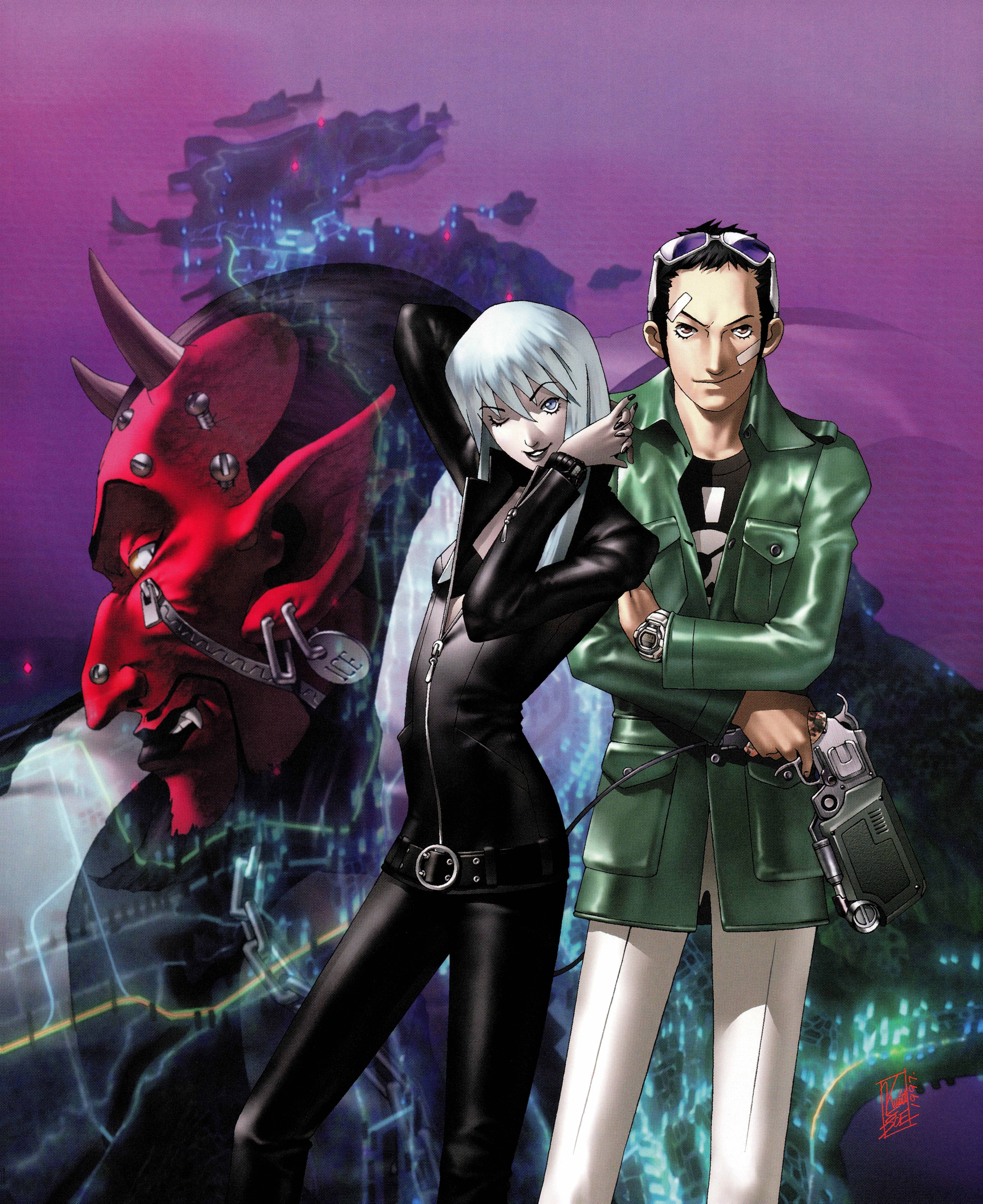 1girl 2boys absurdres artist_name azazel_(megami_tensei) beard black_hair bodysuit colored_skin demon demon_(megami_tensei) devil_summoner:_soul_hackers devil_summoner_(series) earrings eyewear_on_head facial_hair gump_(devil_summoner) highres holding holding_weapon horns jacket jewelry kazuma_kaneko landscape lipstick makeup multiple_boys nemissa official_art one_eye_closed pale_skin photoshop_(medium) pointy_ears protagonist_(soul_hackers) red_skin scan screw shin_megami_tensei shiraishi_megumi_(colorist) signature third-party_source watch weapon white_hair wristwatch zipper