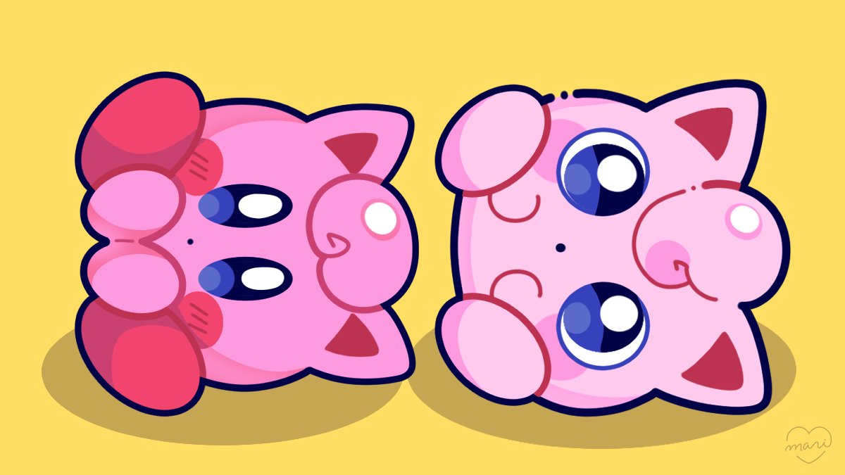 blue_eyes blush_stickers commentary company_connection cosplay creature creature_focus crossover english_commentary gen_1_pokemon jigglypuff jigglypuff_(cosplay) kirby kirby_(series) look-alike looking_at_viewer marikyuunn nintendo no_humans photo-referenced pokemon pokemon_(creature) simple_background super_smash_bros. thick_lineart yellow_background