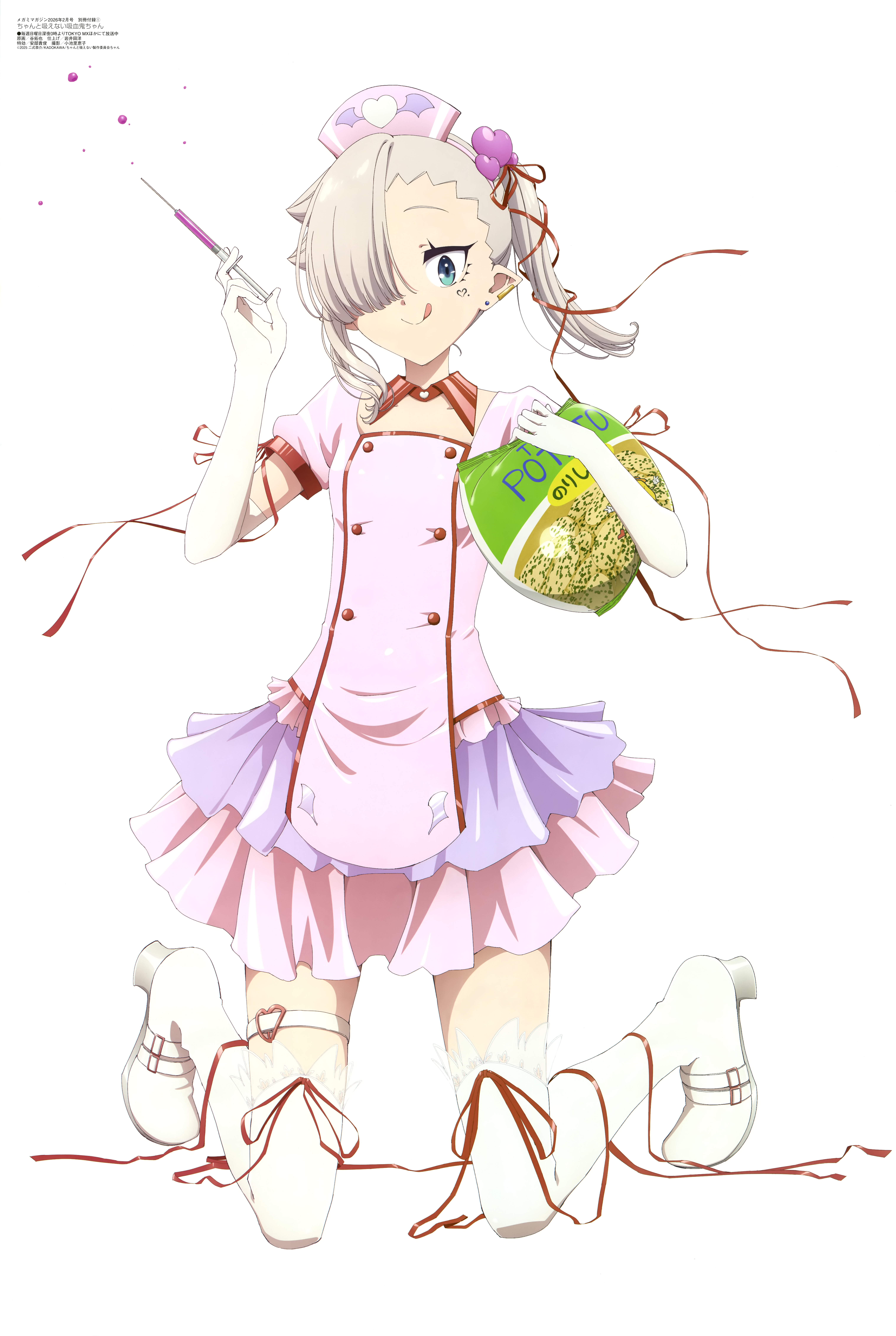1girl :q absurdres anime_coloring blue_eyes boots breasts buttons chanto_suenai_kyuuketsuki-chan chips_(food) collar collarbone copyright_name copyright_notice detached_collar double-breasted dress earclip earrings elbow_gloves facial_mark food full_body gloves grey_hair hair_over_one_eye hair_ribbon hat heart heart_facial_mark high_heel_boots high_heels highres holding holding_syringe ishikawa_luna jewelry kneeling long_hair looking_at_viewer magazine_scan mark_under_eye megami_magazine nurse nurse_cap official_art one_eye_covered pink_dress pointy_ears potato_chips puffy_short_sleeves puffy_sleeves red_collar red_ribbon ribbon scan short_dress short_sleeves side_ponytail simple_background single_sidelock small_breasts smile snack solo stud_earrings syringe tani_takuya thigh_boots thigh_strap third-party_source tongue tongue_out vampire white_background white_boots white_gloves