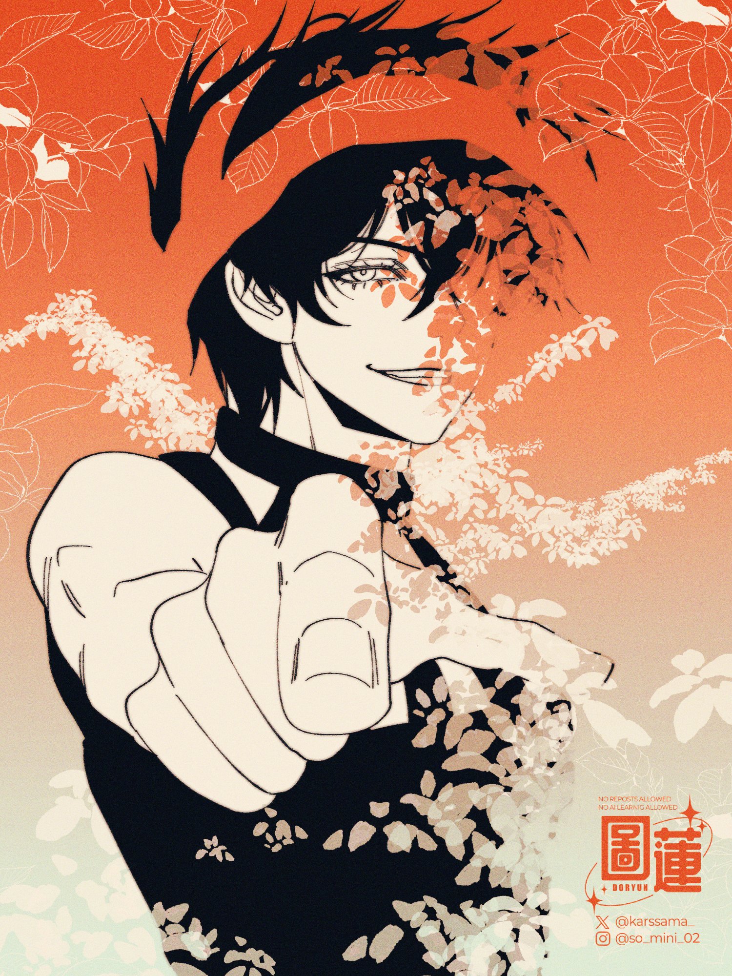 1boy black_hair blending choker commentary_request dissolving fingernails floral_dissolve hairband headband highres jojo_no_kimyou_na_bouken karssama korean_commentary limited_palette looking_at_viewer male_focus narancia_ghirga pointing pointing_at_viewer short_hair sleeveless smile solo tank_top twitter_username upper_body vento_aureo