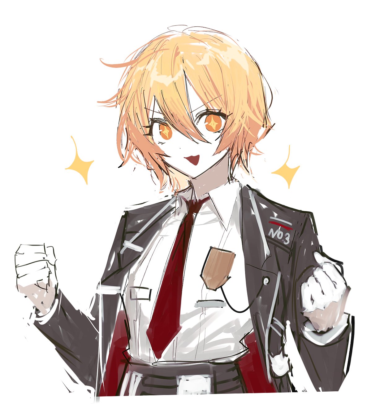 1girl :3 bad_link black_coat black_pants blonde_hair clenched_hands coat collared_shirt cowboy_shot don_quixote_(project_moon) highres lapels limbus_company necktie notched_lapels open_mouth pants project_moon red_necktie remsrar shirt simple_background smile solo source_request sparkle third-party_source white_background white_shirt yellow_eyes