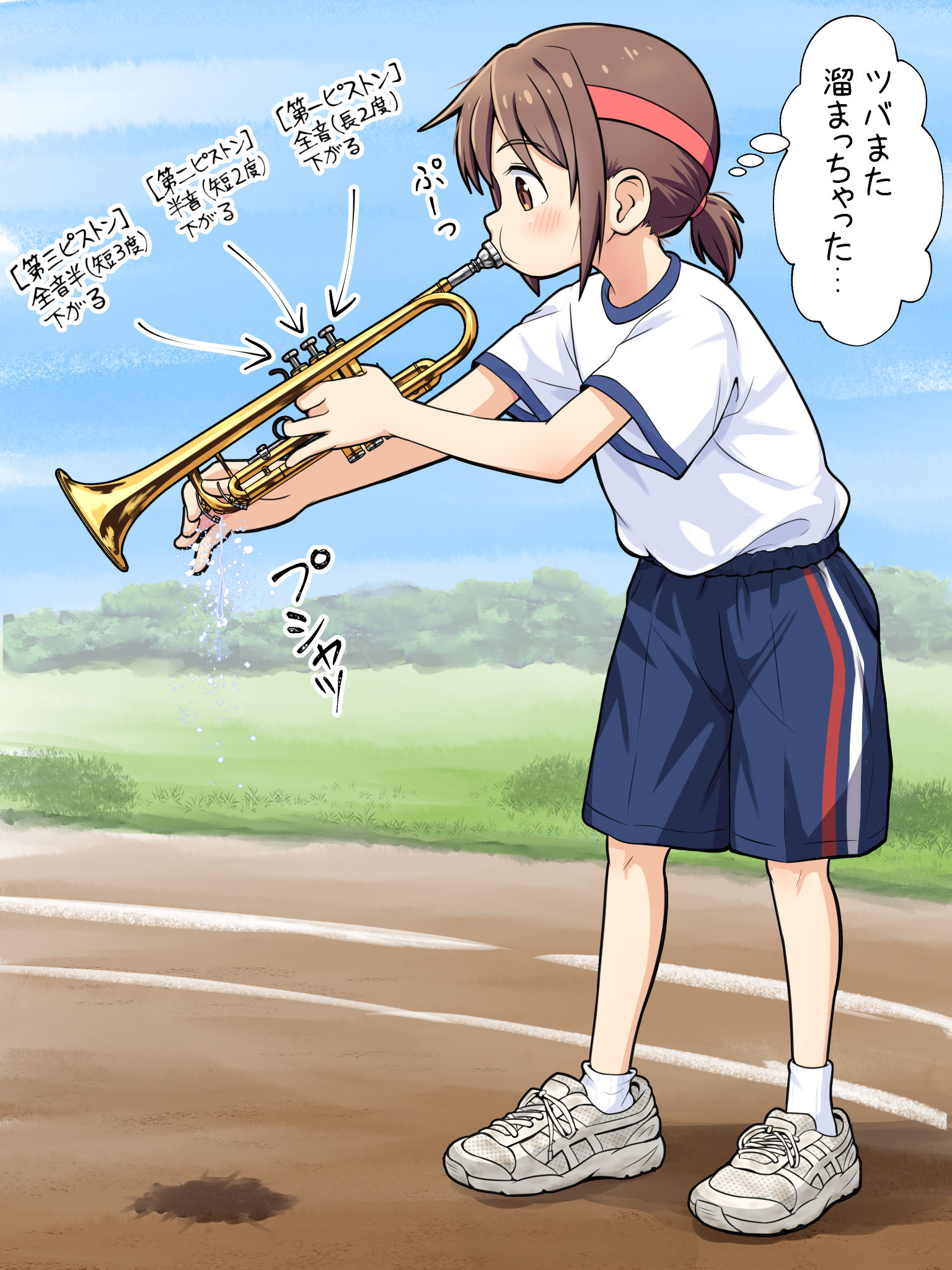 1girl blue_shorts blue_sky blush brown_eyes brown_hair commentary_request day from_side gym_uniform hairband highres holding holding_instrument instrument nodai_musashi original outdoors ponytail profile puffy_cheeks red_hairband running_track saliva shirt shirt_tucked_in shoes short_ponytail short_sleeves shorts sky sneakers solo sound_effects speech_bubble standing thought_bubble trumpet white_shirt white_shoes