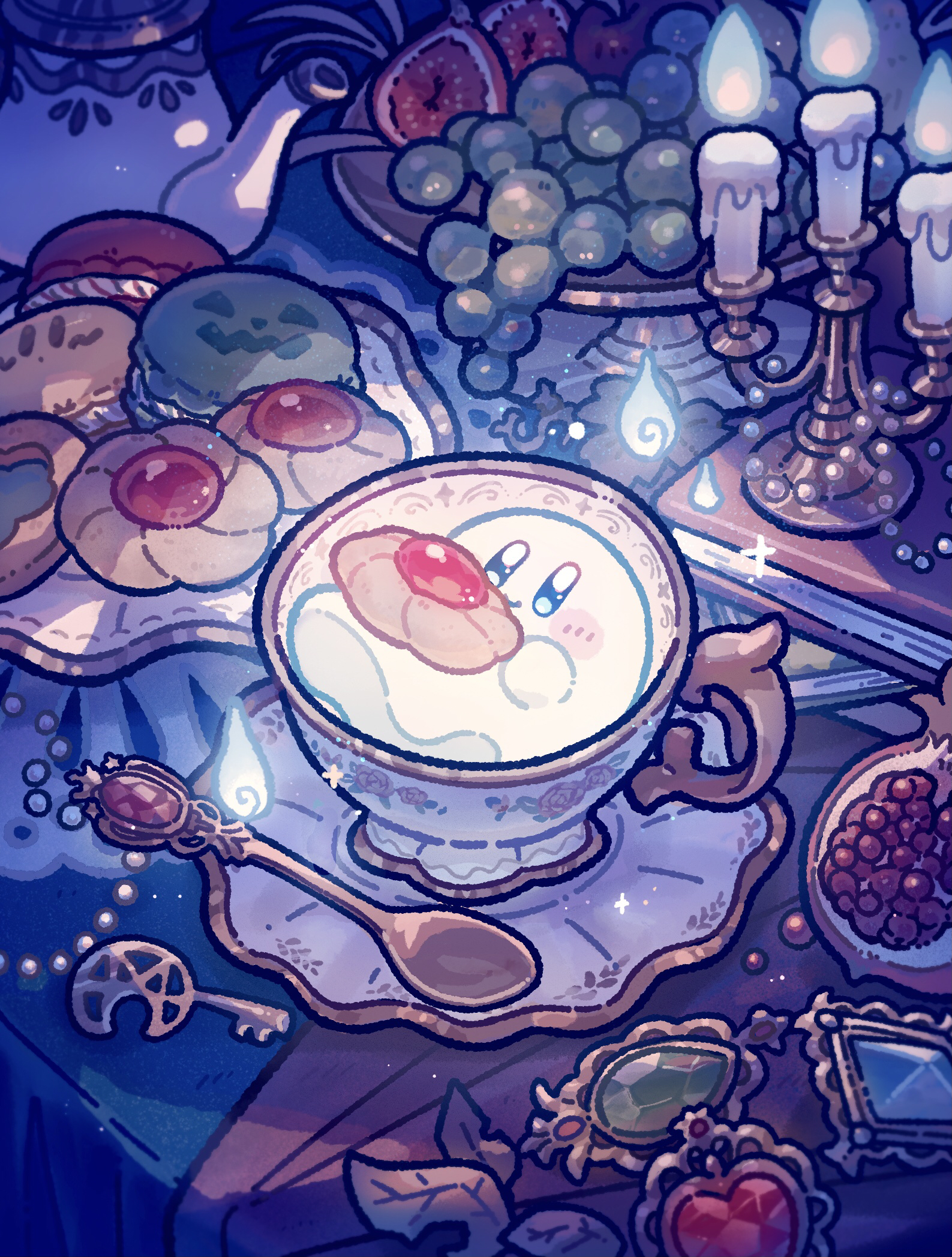 autumn_leaves blue_eyes blue_fire book candle commentary_request cookie crescent cup cutlery fire food fruit ghost ghost_kirby grapes harukui highres holding holding_food key kirby kirby_(series) leaf macaron nintendo no_humans official_alternate_costume pomegranate smile spoon sweets teacup teapot thumbprint_cookie