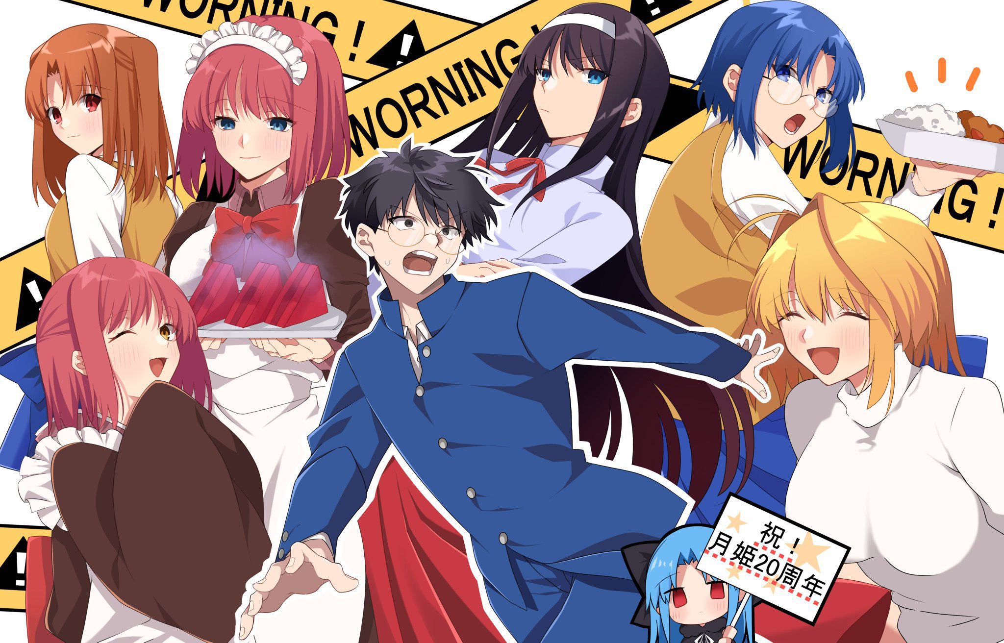 1boy 6+girls ahoge apron arcueid_brunestud bad_food black_bow black_eyes black_hair blonde_hair blue_eyes blush bow breasts brown_hair brown_kimono ciel_(tsukihime) closed_eyes crossed_arms curry curtained_hair exa_(koyuru) food formal_clothes gakuran glasses hair_intakes highres hisui_(tsukihime) holding holding_plate holding_sign japanese_clothes kagetsu_tooya kimono kohaku_(tsukihime) large_breasts laughing leaning_forward len_(tsukihime) long_hair looking_back maid maid_apron maid_headdress multiple_girls nervous_sweating one_eye_closed open_mouth pink_hair plate red_eyes red_ribbon red_skirt ribbon running sandwich school_uniform shirt short_hair sidelocks sign skirt smile sweat tohno_akiha tohno_shiki tsukihime two_side_up vest white_shirt yellow_vest yumizuka_satsuki