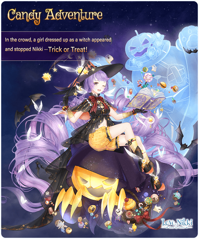 1girl absurdly_long_hair artist_request black_boots black_dress black_gloves black_hat bloomers book boots border bow bowtie bracelet brown_eyes candy candy_adventure_(miracle_nikki) candy_cane character_name cherry cookie copyright_logo crescent crescent_hat_ornament cupcake diamond_print dot_nose dress drill_hair english_text food fruit full_body ghost gloves gradient_gloves hair_bow halloween happy hat hat_ornament high_heel_boots high_heels holding holding_book holding_wand jack-o'-lantern jewelry kneehighs light_blush logo lollipop long_dress long_hair low_twintails midriff miracle_nikki multiple_hair_bows navel night nikki_(series) official_art one_eye_closed open_book open_mouth orange_bloomers outdoors print_headwear purple_hair red_bow red_bowtie ribbon-trimmed_socks ribbon_trim short_sleeves sitting sky smile socks solo star_(sky) star_(symbol) star_hat_ornament starry_sky striped_bow striped_bowtie striped_clothes striped_dress swept_bangs swirl_lollipop tareme teeth third-party_source turning_page twin_drills twintails two-sided_fabric two-sided_skirt underwear upper_teeth_only vertical-striped_clothes vertical-striped_dress very_long_hair wand white_border white_bow wide_sleeves winged_boots witch witch_hat wrist_bow yellow_socks