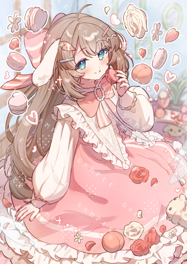 1girl ahoge animal_ears blue_eyes blush bow bowtie brown_hair closed_mouth commentary_request commission dress floppy_ears food frilled_dress frills full_body hair_bow hair_ornament hairclip hanausa_fuka heart holding holding_food indie_virtual_youtuber long_hair long_sleeves looking_at_viewer macaron pink_bow pink_bowtie pink_dress rabbit_ears rabbit_girl sitting skeb_commission smile solo striped_bow striped_bowtie striped_clothes tsukumi_bis virtual_youtuber