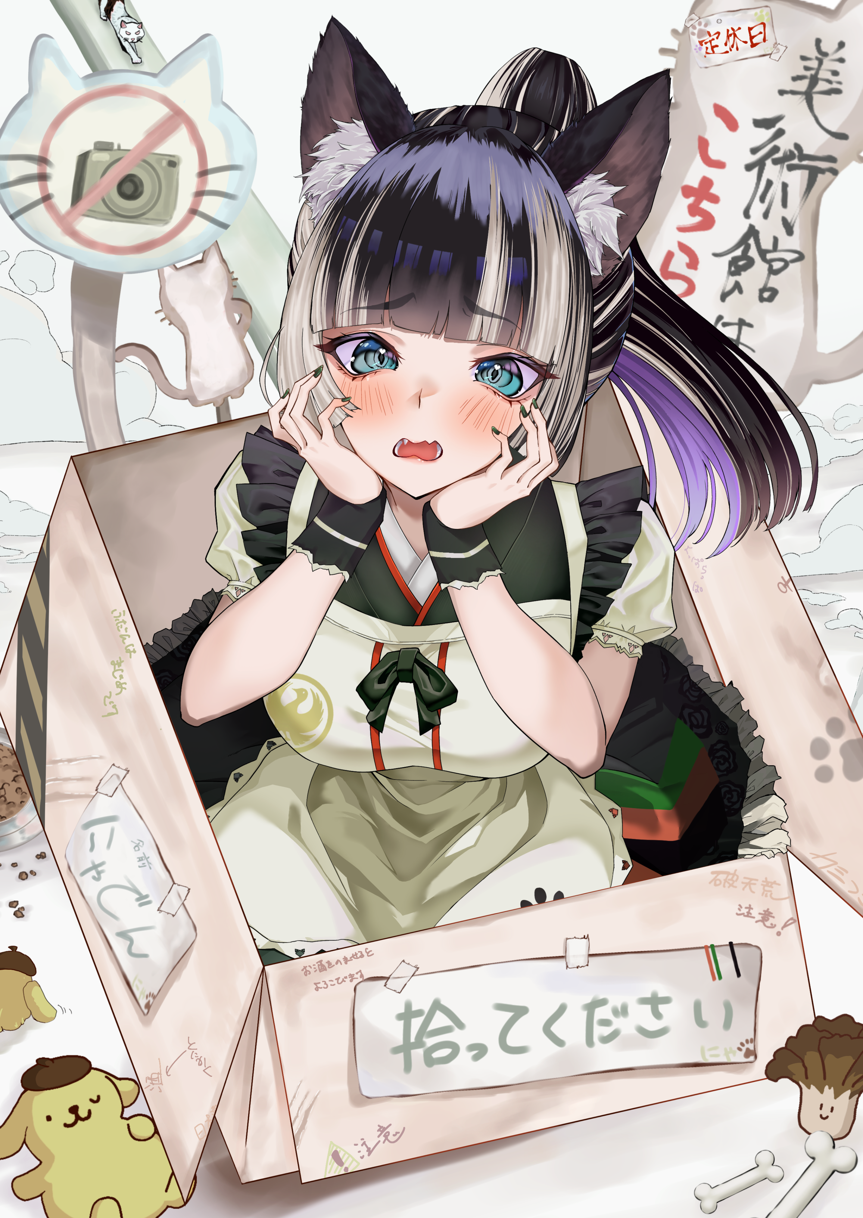 1girl absurdres alternate_costume animal_ear_fluff animal_ears black_hair black_nails blue_eyes blush box cat_ears cat_girl commentary_request grey_streaks hands_on_own_face highres hololive hololive_dev_is in_box in_container juufuutei_raden long_hair looking_at_viewer na_nu_017 nail_polish open_mouth ponytail solo virtual_youtuber