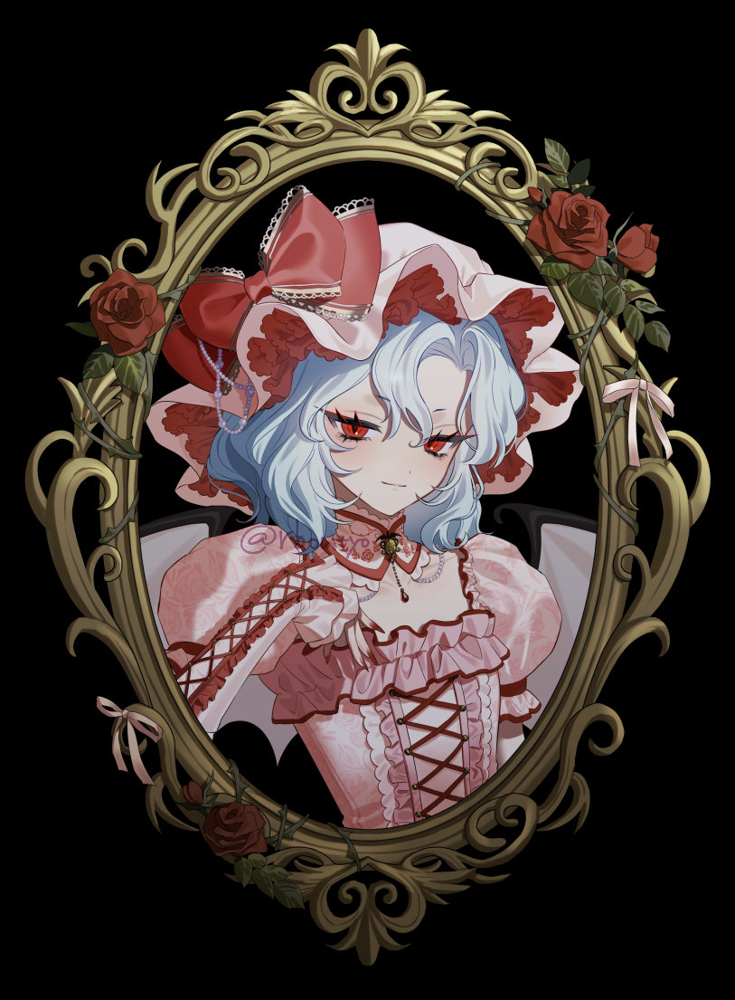 1girl bat_wings black_background black_wings bow carbonara_hontyotyo closed_mouth commentary cross-laced_clothes cross-laced_dress detached_collar dress flower hair_between_eyes hat hat_bow long_sleeves looking_at_viewer mob_cap picture_frame pink_dress pink_hat plant red_bow red_eyes red_flower red_nails red_rose remilia_scarlet rose short_hair slit_pupils smile solo symbol-only_commentary thorns touhou upper_body vines wings