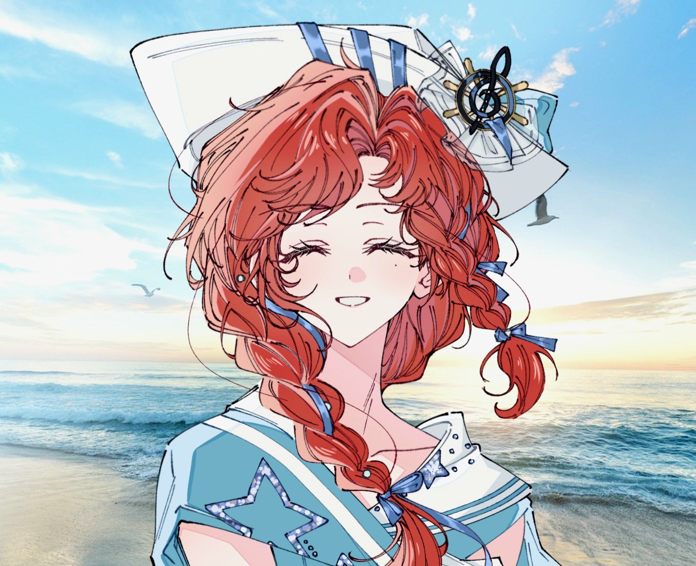 1girl ^_^ barcarola_(reverse:1999) beach bird blue_shirt blue_sky braid closed_eyes commentary_request dixie_cup_hat facing_viewer gradient_sky grin hat korean_commentary military_hat mole mole_under_eye ocean photo_background red_hair reverse:1999 sailor_collar sand seagull shirt sky smile sogongnyeo solo twin_braids upper_body white_hat