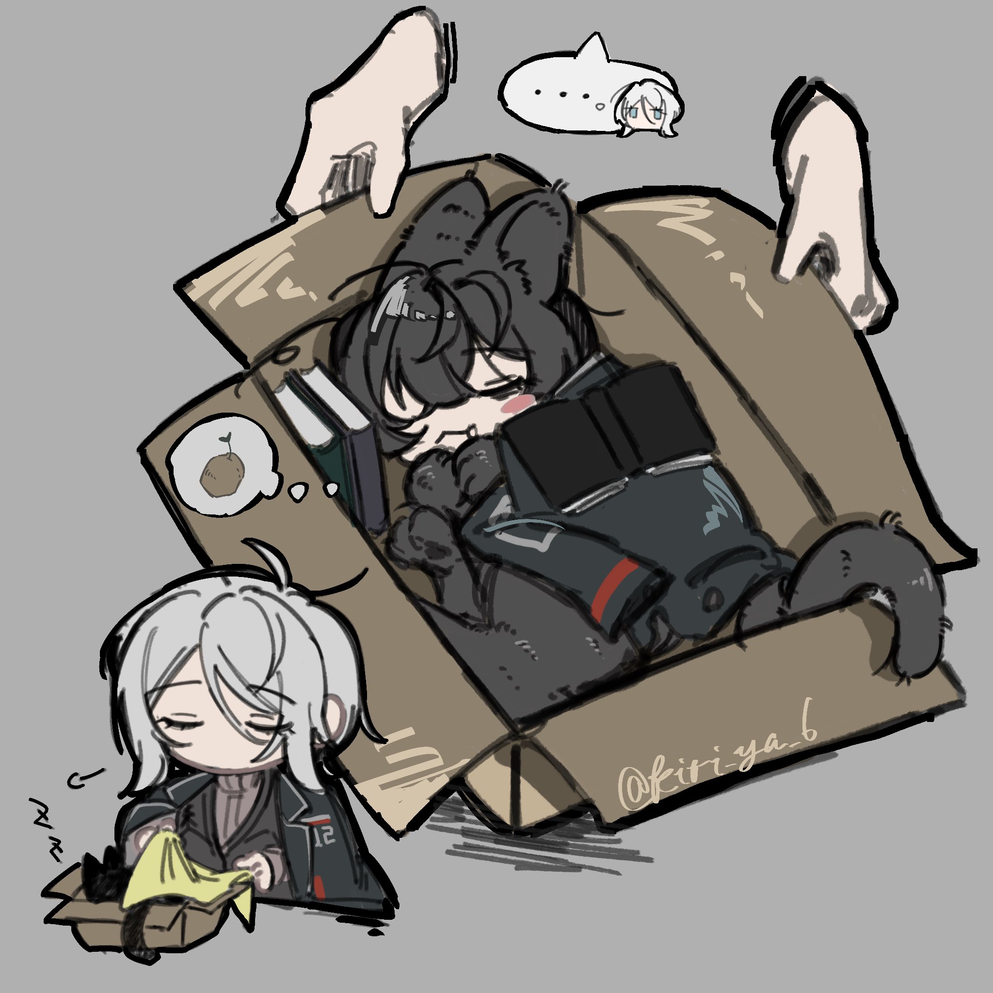 ... animal_ears animalization black_coat black_fur black_hair black_vest blanket blue_eyes book box cat cat_ears cat_tail coat commentary faust_(project_moon) highres kiri_ya_6 limbus_company medium_hair potato project_moon short_hair speech_bubble sweater symbol-only_commentary tail thought_bubble turtleneck turtleneck_sweater vest white_hair yi_sang_(project_moon)