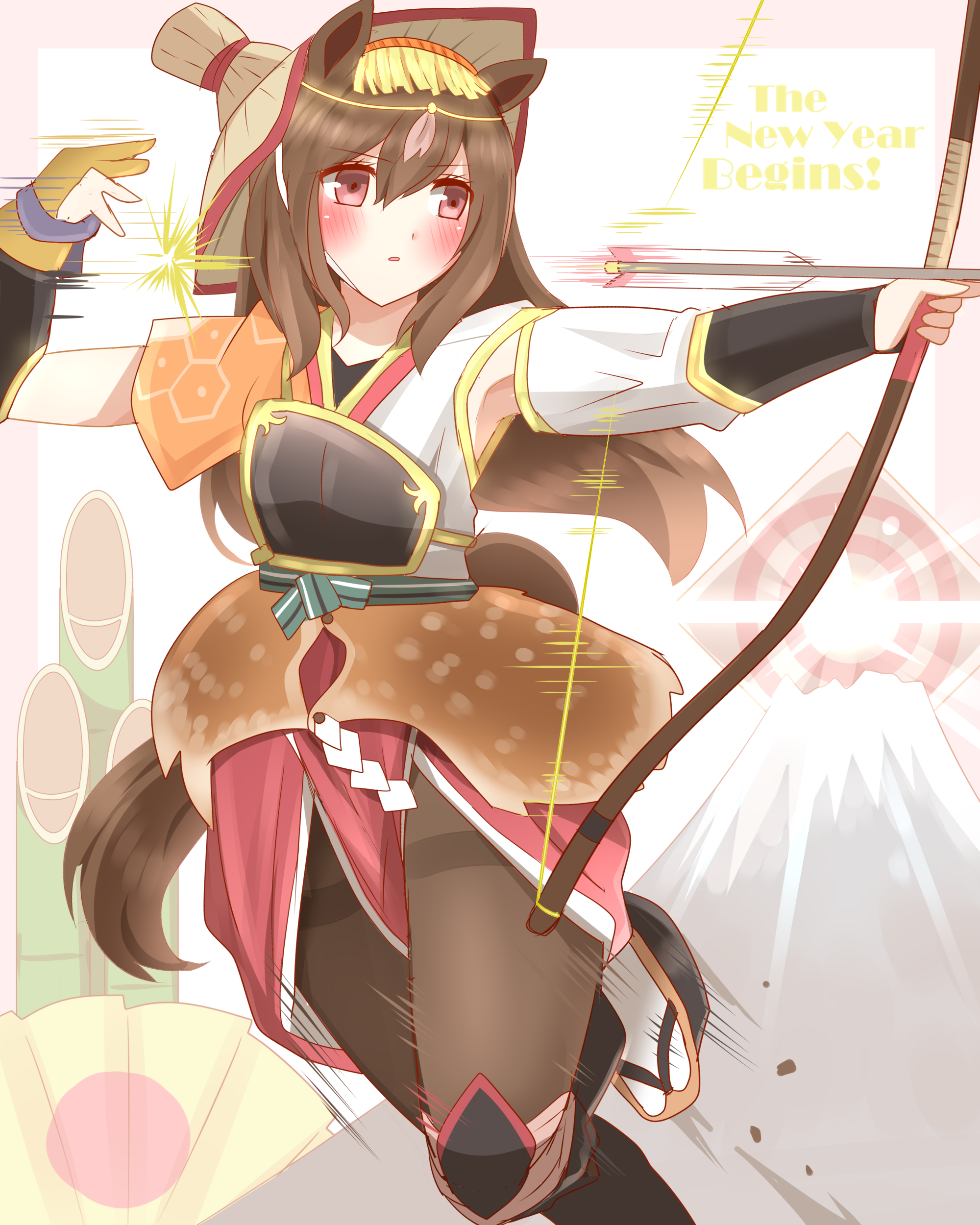 1girl absurdres animal_ears archery_shooting_glove arrow_(projectile) blush border bow_(weapon) brown_gloves brown_hair brown_pantyhose chinese_zodiac commentary_request english_text gloves hair_between_eyes highres holding holding_bow_(weapon) holding_weapon horse_ears horse_girl horse_tail japanese_clothes kadomatsu kimono motion_blur mount_fuji muneate non_(wednesday-classic) original pantyhose parted_lips partially_fingerless_gloves pink_border red_eyes red_skirt shide skirt solo standing standing_on_one_leg tail target thighband_pantyhose weapon white_background white_kimono year_of_the_horse