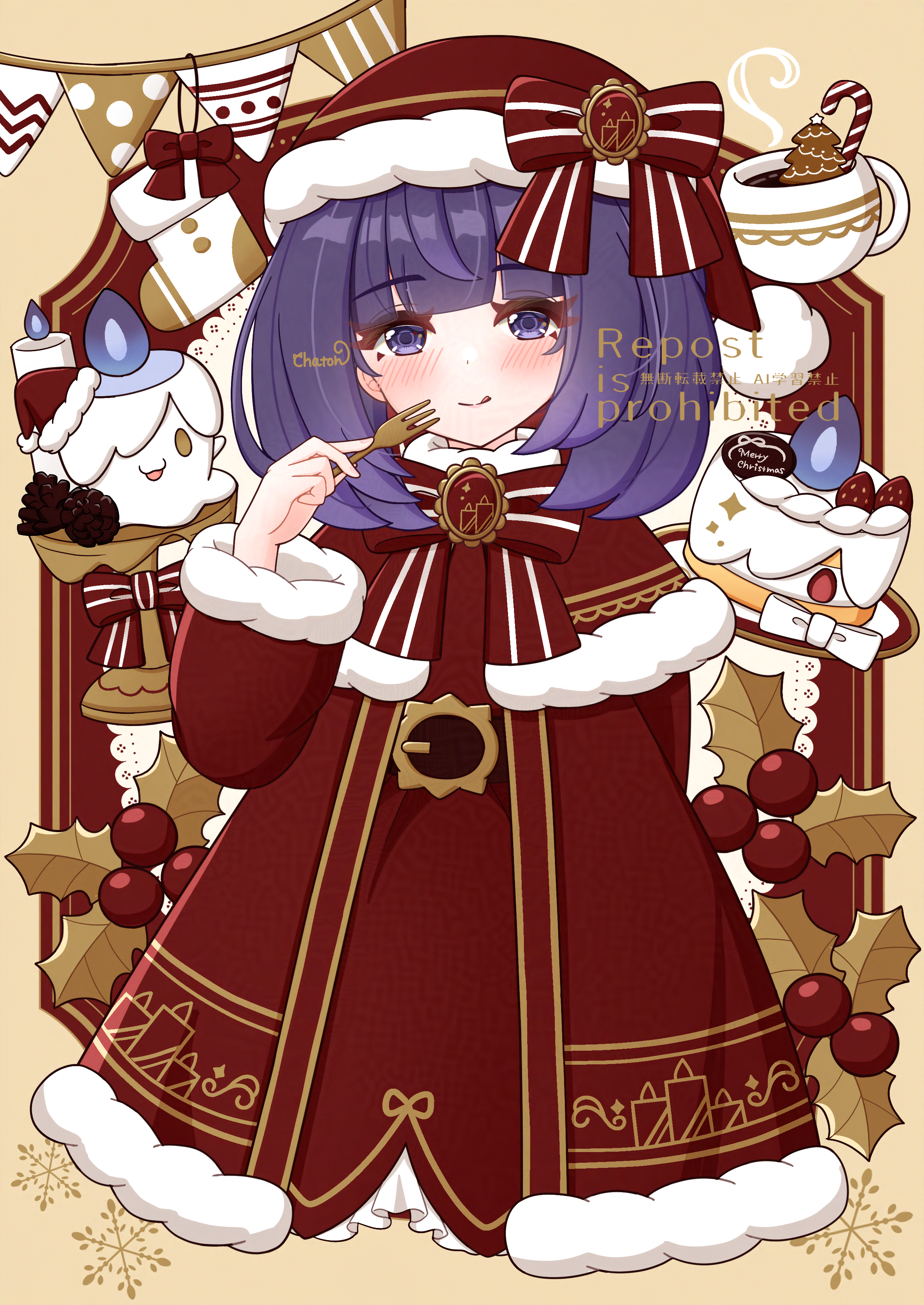 1girl :p absurdres alternate_costume arm_behind_back artist_name blunt_bangs blush bob_cut bow bowtie buckle cake candle capelet chaton_(chatoncerisier) check_commentary christmas_stocking closed_mouth commentary commentary_request cup dress food fork gen_5_pokemon gwynn_(pokemon) hat hat_bow highres holding holding_fork holly litwick long_sleeves merry_christmas nintendo pokemon pokemon_(creature) pokemon_legends:_z-a purple_eyes purple_hair red_bow red_bowtie red_capelet red_dress santa_costume santa_dress santa_hat short_hair smile striped_bow teacup tongue tongue_out