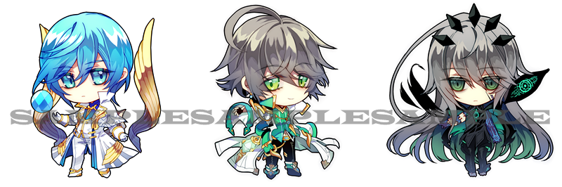 3boys ahoge ainchase_ishmael apostasia_(elsword) arme_thaumaturgy_(elsword) artist_name athria black_gloves black_pants blue_eyes blue_hair chibi chinese_commentary closed_mouth coat colored_inner_hair commentary_request core earrings elsword empty_eyes erbluhen_emotion_(elsword) fingerless_gloves full_body gloves green_eyes green_hair green_vest grey_hair hair_between_eyes jewelry long_hair long_sleeves looking_at_viewer male_focus merchandise_available multicolored_hair multiple_boys multiple_persona open_clothes open_coat orb pants ringed_eyes shoes short_hair simple_background smile very_long_hair vest watermark white_background white_coat white_gloves white_pants white_shoes white_vest