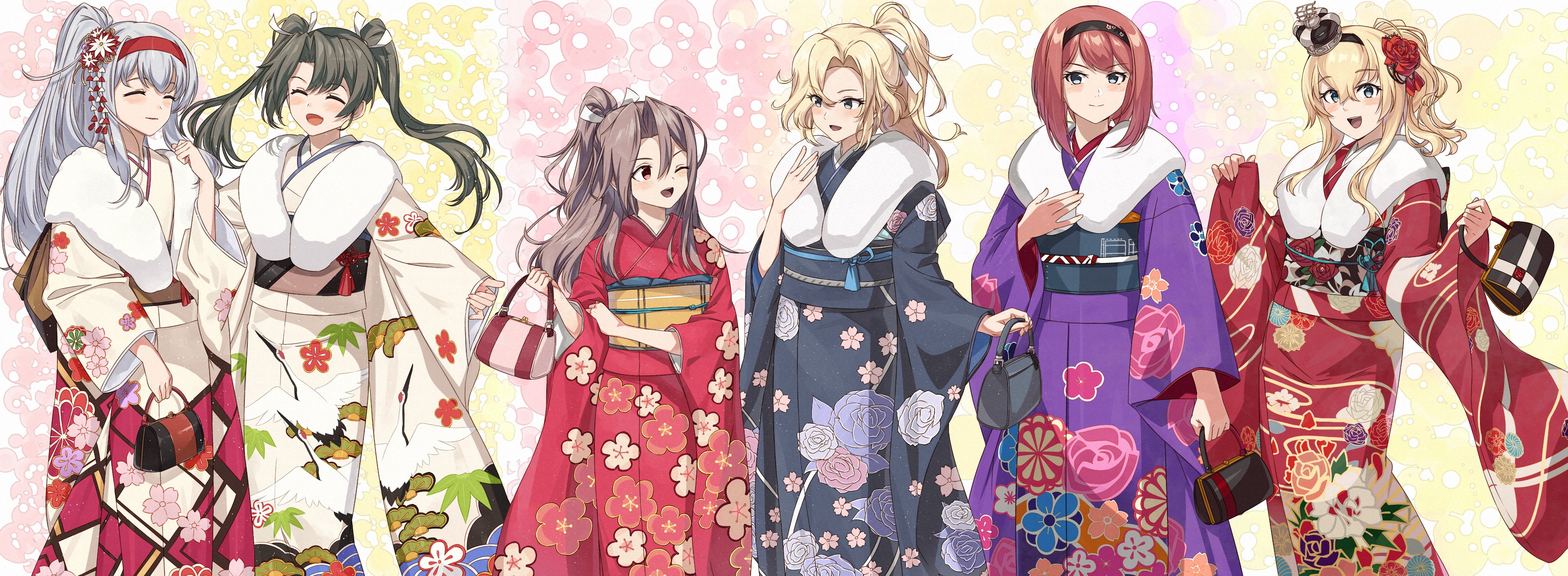 2girls absurdres alternate_costume ark_royal_(kancolle) ark_royal_(new_year)_(kancolle) bag black_hairband black_kimono blonde_hair blue_eyes blush brown_eyes brown_hair closed_eyes commentary commentary_request commission crown floral_print flower furisode grey_eyes grey_hair hair_flower hair_ornament hair_ribbon hairband handbag haregi high_ponytail highres holding holding_bag hornet_(kancolle) hornet_(new_year)_(kancolle) japanese_clothes kanmiya_shinobu kantai_collection kimono long_hair long_sleeves looking_at_viewer mini_crown multiple_girls obi official_alternate_costume one_eye_closed open_mouth pink_kimono ponytail print_kimono purple_kimono red_flower red_hair red_hairband red_kimono red_rose ribbon rose sash shoukaku_(kancolle) shoukaku_kai_ni_(kancolle) sidelocks simple_background skeb_commission smile standing tassel twintails warspite_(kancolle) warspite_(new_year)_(kancolle) white_fur white_hair white_kimono white_ribbon wide_sleeves zuihou_(kancolle) zuihou_(new_year)_(kancolle) zuihou_kai_ni_(kancolle) zuikaku_(kancolle) zuikaku_(new_year)_(kancolle) zuikaku_kai_ni_(kancolle)