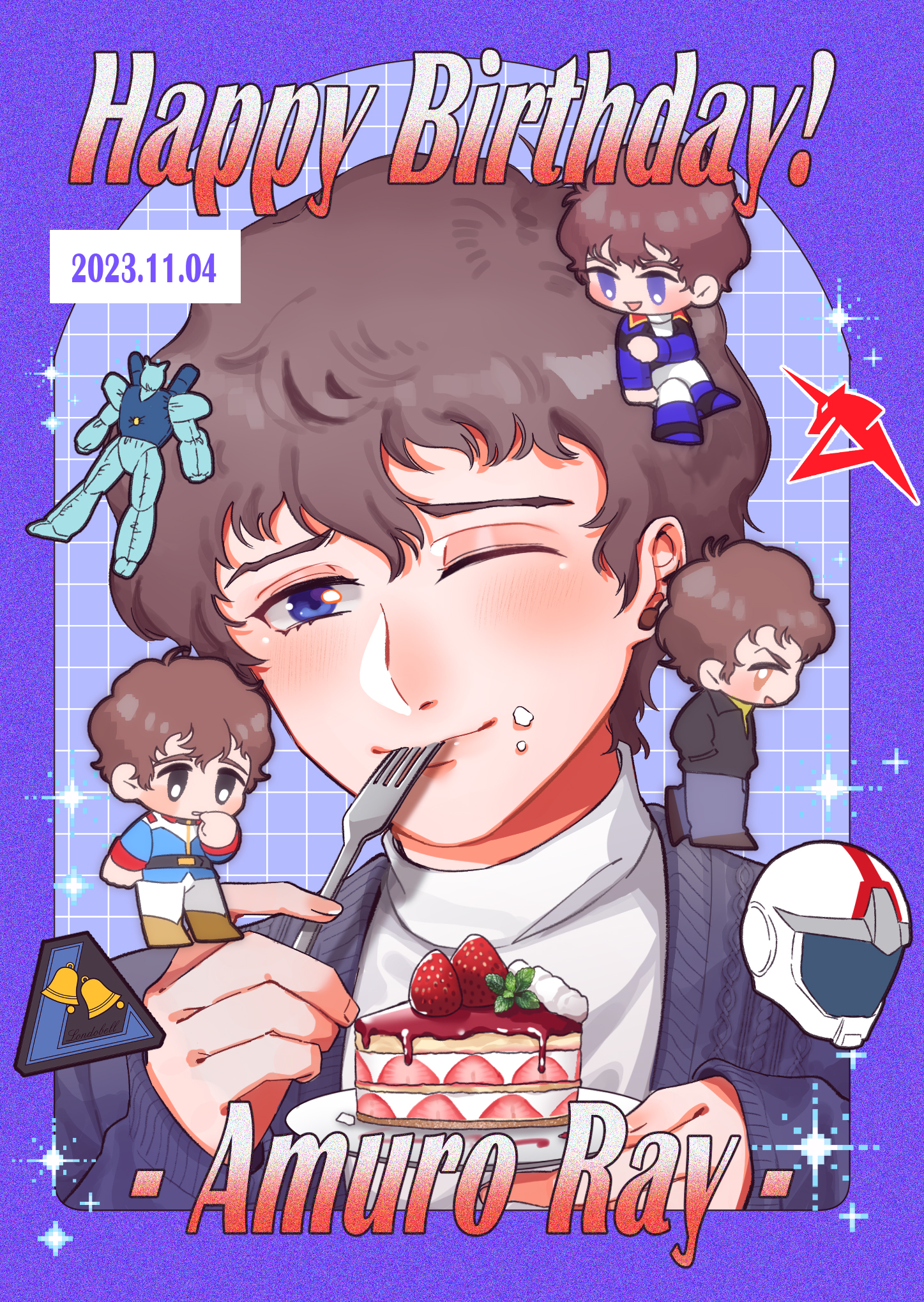 1boy amuro_ray belt black_belt black_eyes black_jacket blue_background blue_border blue_cardigan blue_eyes blue_jacket blue_pants border brown_eyes brown_hair cake cake_slice cardigan char's_counterattack character_name chibi chibi_inset closed_mouth commentary_request crossed_arms dated eclipseb food food_on_face fork fruit grid_background gundam hands_in_pockets happy_birthday helmet highres holding holding_fork holding_plate jacket long_sleeves looking_at_viewer male_focus mobile_suit_gundam one_eye_closed outside_border pants plate shirt short_hair simple_background smile sparkle strawberry turtleneck unworn_headwear unworn_helmet upper_body white_pants white_shirt yellow_shirt zeta_gundam