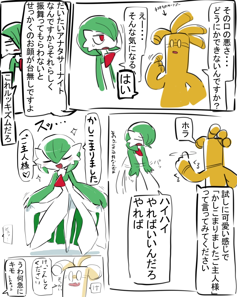 1girl 1other arms_at_sides arrow_(symbol) blank_eyes blonde_hair blush bob_cut closed_eyes colored_skin comic curtsey flat_chest full_body gardevoir gen_3_pokemon gholdengo green_hair green_skin hair_over_one_eye half-closed_eyes hand_up heart highres japanese_text jitome leaning_forward legs_together lettuce_no_hito motion_lines multicolored_skin multiple_views nintendo one_eye_covered open_mouth pokemon pokemon_(creature) red_eyes short_hair sketch sparkle speech_bubble spoken_heart standing sweat talking translation_request two-tone_skin u_u white_skin yellow_eyes yellow_skin