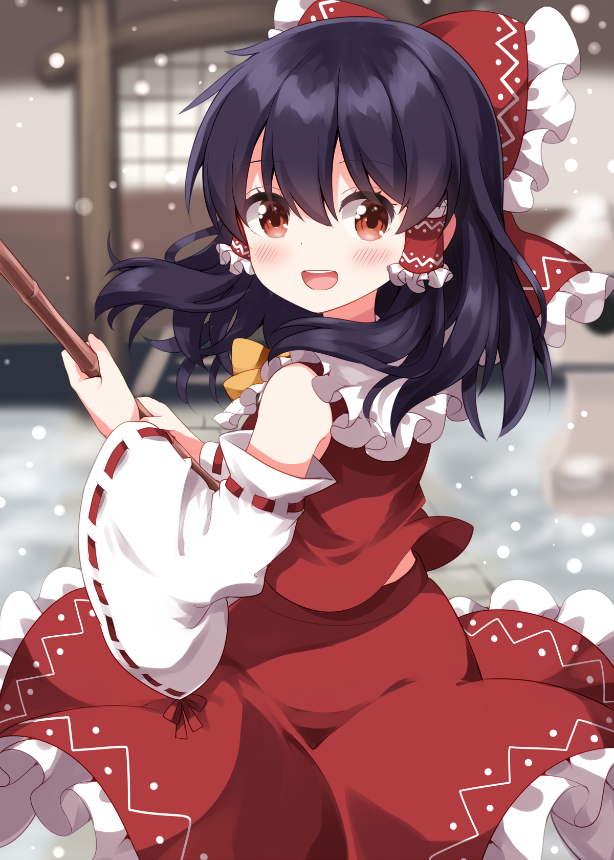 1girl ascot bamboo_broom blurry blush bow broom brown_eyes brown_hair commentary_request completion_time depth_of_field detached_sleeves frilled_bow frilled_hair_tubes frilled_skirt frills hair_bow hair_tubes hakurei_reimu highres holding holding_broom long_hair looking_at_viewer open_mouth red_bow red_skirt ribbon-trimmed_sleeves ribbon_trim ruu_(tksymkw) skirt skirt_set smile solo teeth touhou upper_teeth_only yellow_ascot