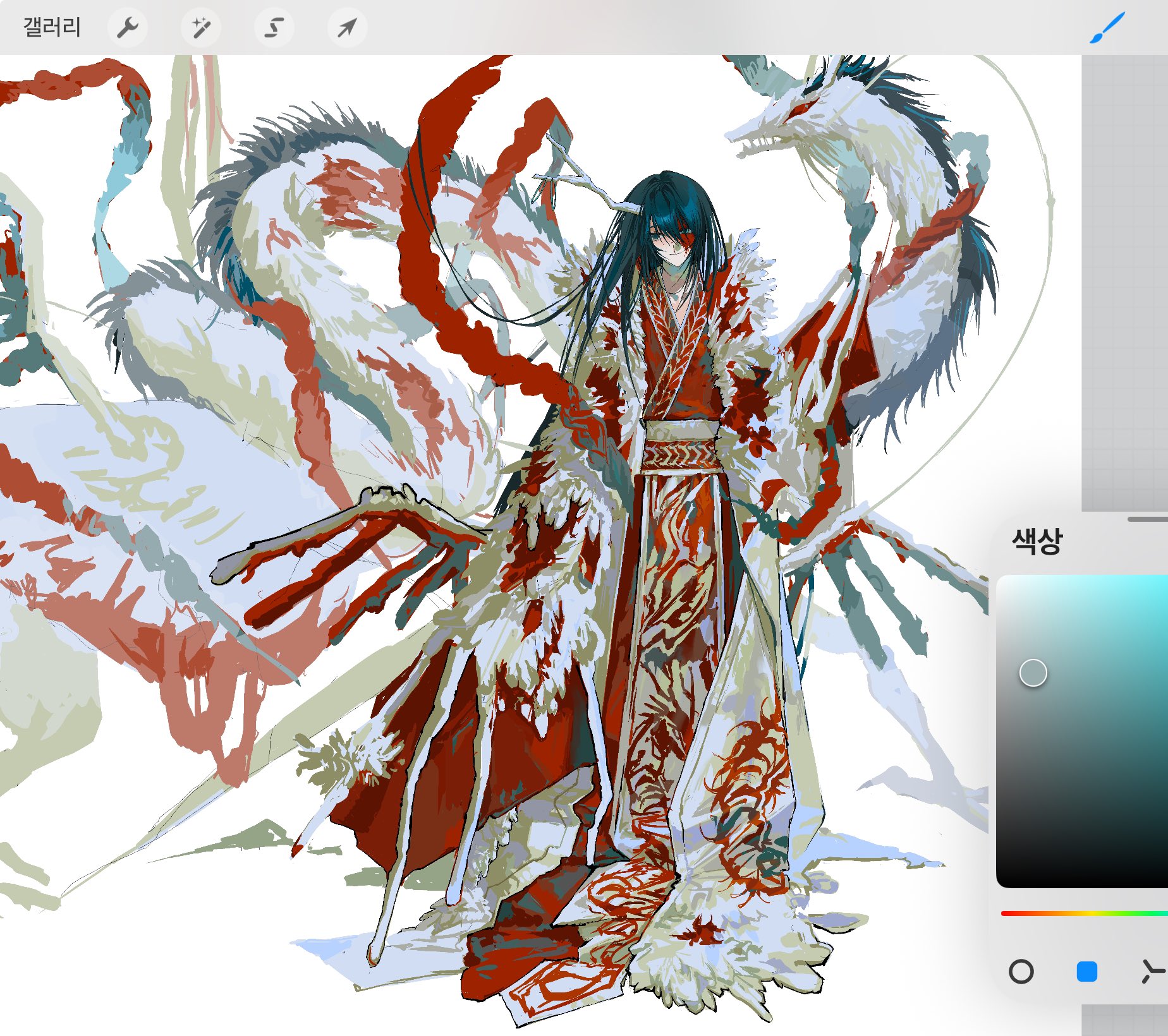 1boy aqua_eyes art_program_in_frame black_eyes black_hair chinese_clothes closed_mouth coat dragon dragon_horns e.g.o_(project_moon) eastern_dragon eastern_dragon_horns full_body hanfu heterochromia highres hong_lu_(project_moon) horns limbus_company project_moon red_hanfu sash simple_background skeletal_wings smile solo tears_of_the_tarnished_blood_(e.g.o) usnorway_goa white_background white_coat white_sash wings