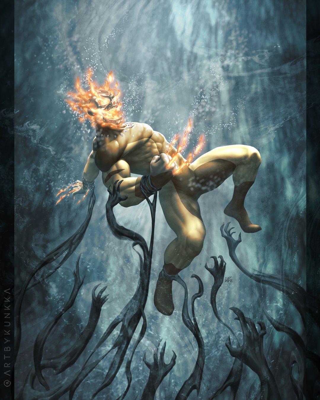 1boy air_bubble asphyxiation bodysuit brown_bodysuit bubble claws comic_cover commentary covered_abs daken disembodied_hand drowning english_commentary fire flaming_skull hellverine highres kunkka male_focus marvel multicolored_bodysuit muscular muscular_male official_art skull skull_head solo superhero_costume underwater wolverine_(x-men) x-men yellow_bodysuit