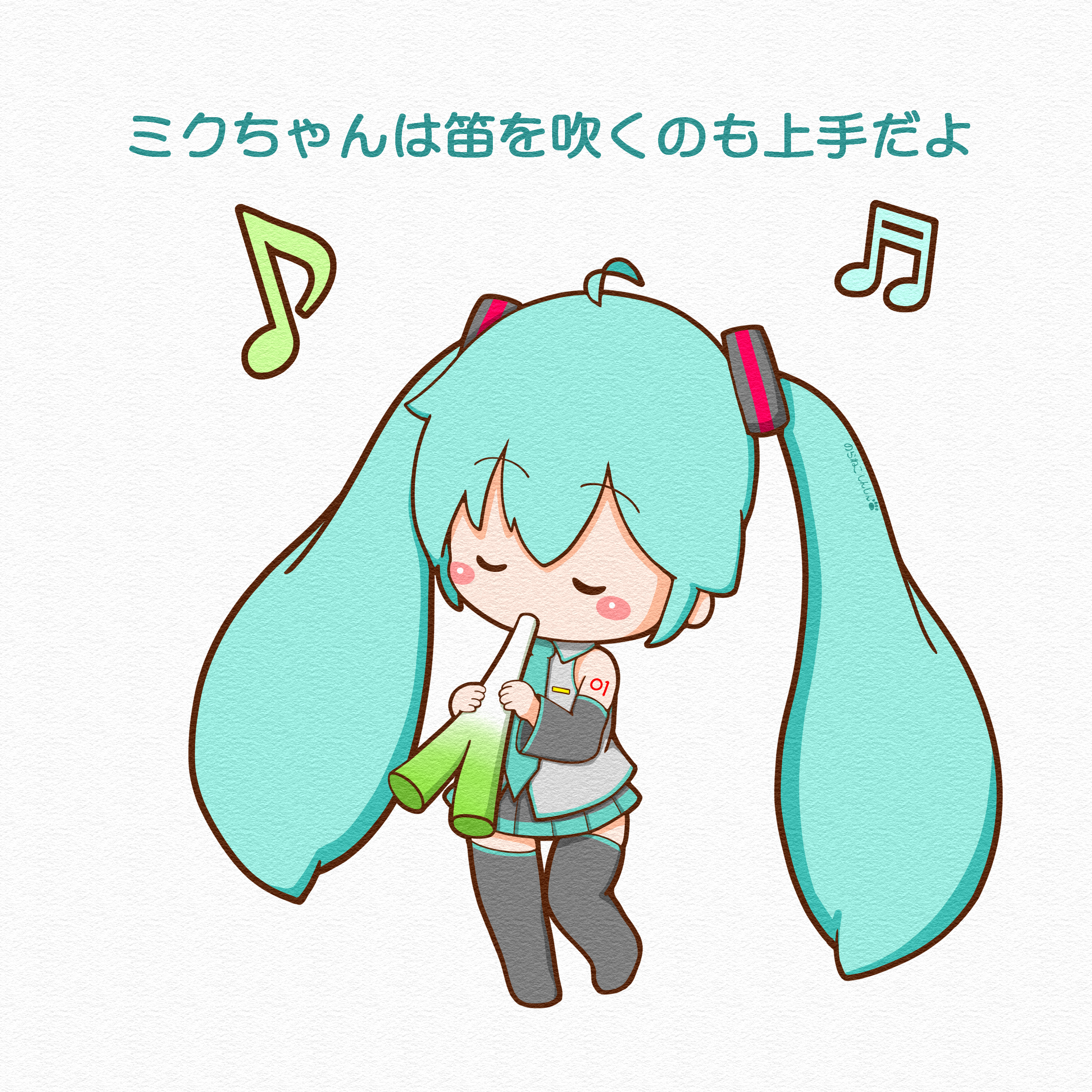 1girl absurdres aqua_hair chibi chibi_only closed_eyes commentary_request food full_body hatsune_miku highres holding holding_food holding_spring_onion holding_vegetable instrument music musical_note playing_instrument sh1n_chan solo spring_onion standing twintails vegetable vocaloid